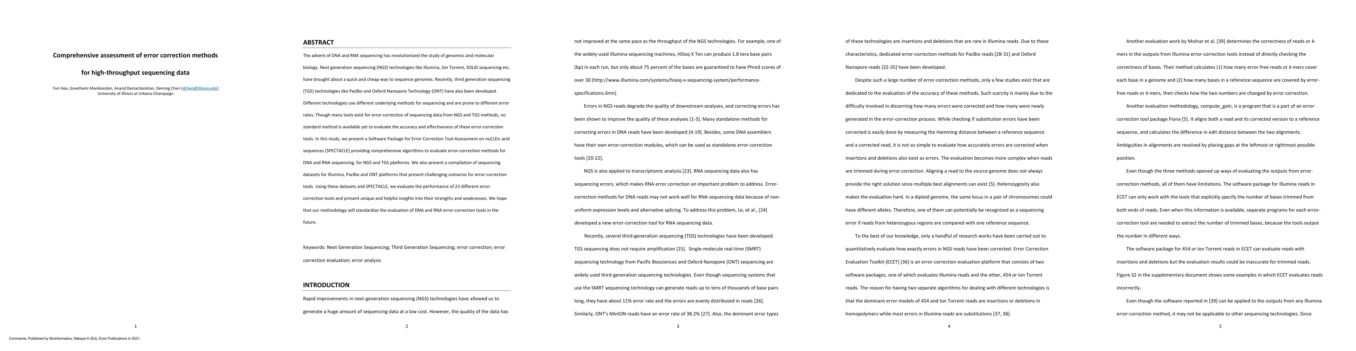 This paper presents SPECTACLE, a software package for evaluating error-correction methods for high-throughput sequencing data, and assesses the performance of 23 error-correction tools using datasets from Illumina, PacBio, and ONT platforms, providing insights into their strengths and weaknesses. The study aims to standardize the evaluation of DNA and RNA sequencing error-correction tools.