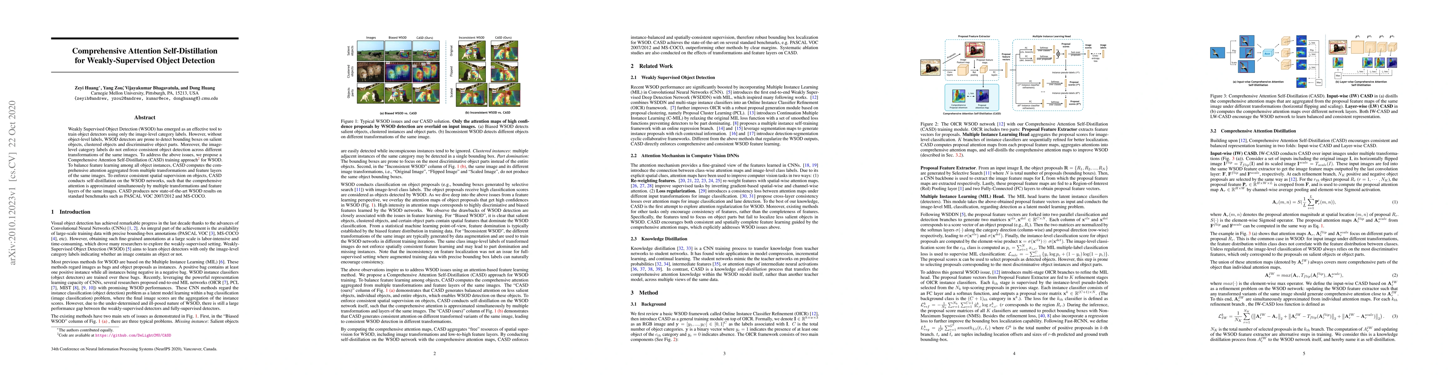 The paper proposes Comprehensive Attention Self-Distillation (CASD) to improve Weakly Supervised Object Detection (WSOD) by balancing feature learning and enforcing consistent spatial supervision across transformations. CASD achieves state-of-the-art results on benchmarks like PASCAL VOC and MS-COCO.