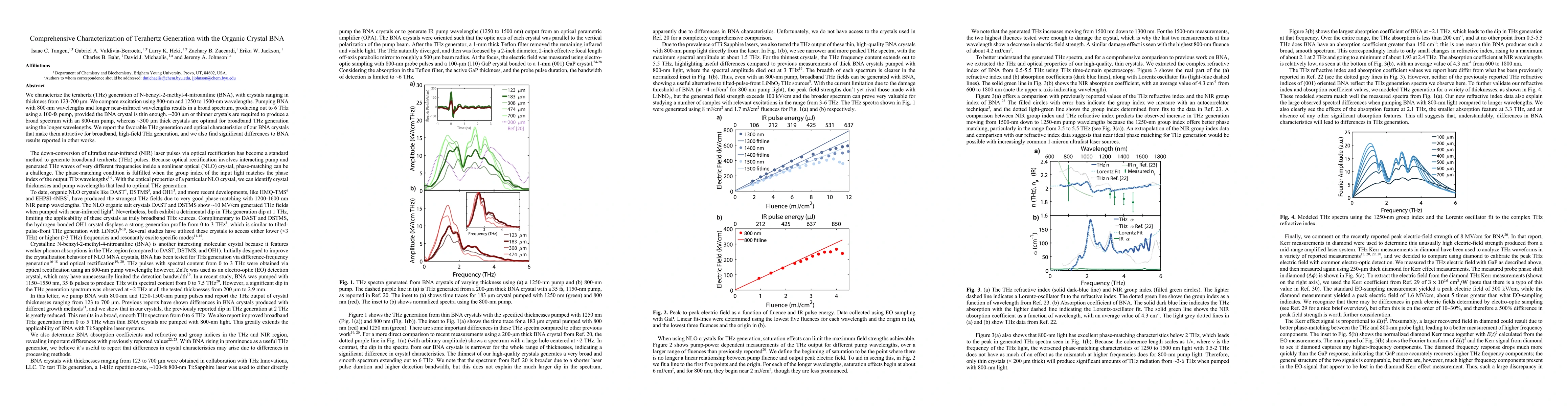 This research is significant as it identifies BNA crystals as an excellent option for generating smooth, broadband THz spectra for spectroscopy, with no absorption features above 200 cm-1 and good phase-matching with 1250-nm NIR light. The findings offer an alternative to LiNbO3-based THz sources, providing a broader bandwidth and relatively high-field alternative, although not yet matching peak-field strengths.