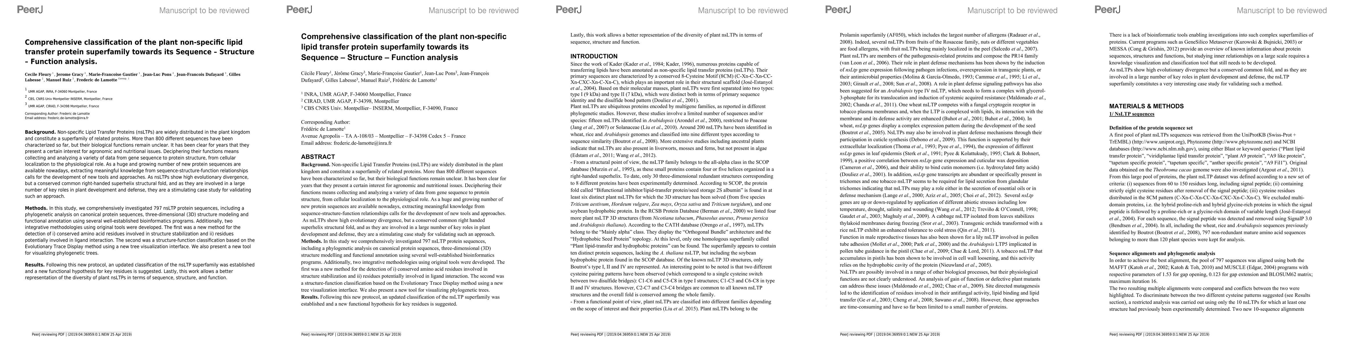 Background. Non-specific Lipid Transfer Proteins (nsLTPs) are widely distributed in the plant kingdom and constitute a superfamily of related proteins. More than 800 different sequences have been characterized so far, but their biological functions remain unclear. It has been clear for years that they present a certain interest for agronomic and nutritional issues. Deciphering their functions means collecting and analyzing a variety of data from gene sequence to protein structure, from cellular localization to the physiological role. As a huge and growing number of new protein sequences are available nowadays, extracting meaningful knowledge from sequence-structure-function relationships calls for the development of new tools and approaches. As nsLTPs show high evolutionary divergence, but a conserved common right-handed superhelix structural fold, and as they are involved in a large number of key roles in plant development and defense, they are a stimulating case study for validating such an approach.