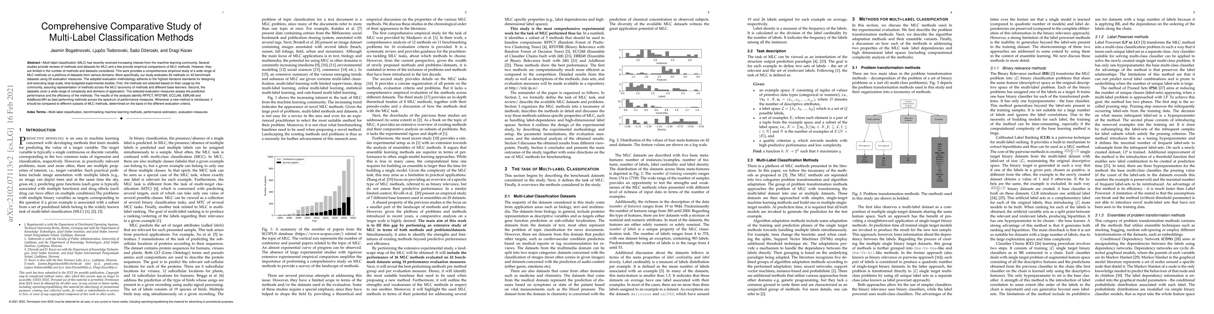 Multi-label classification (MLC) has recently received increasing interest from the machine learning community. Several studies provide reviews of methods and datasets for MLC and a few provide empirical comparisons of MLC methods. However, they are limited in the number of methods and datasets considered. This work provides a comprehensive empirical study of a wide range of MLC methods on a plethora of datasets from various domains. More specifically, our study evaluates 26 methods on 42 benchmark datasets using 20 evaluation measures. The adopted evaluation methodology adheres to the highest literature standards for designing and executing large scale, time-budgeted experimental studies. First, the methods are selected based on their usage by the community, assuring representation of methods across the MLC taxonomy of methods and different base learners. Second, the datasets cover a wide range of complexity and domains of application. The selected evaluation measures assess the predictive performance and the efficiency of the methods. The results of the analysis identify RFPCT, RFDTBR, ECCJ48, EBRJ48 and AdaBoostMH as best performing methods across the spectrum of performance measures. Whenever a new method is introduced, it should be compared to different subsets of MLC methods, determined on the basis of the different evaluation criteria.