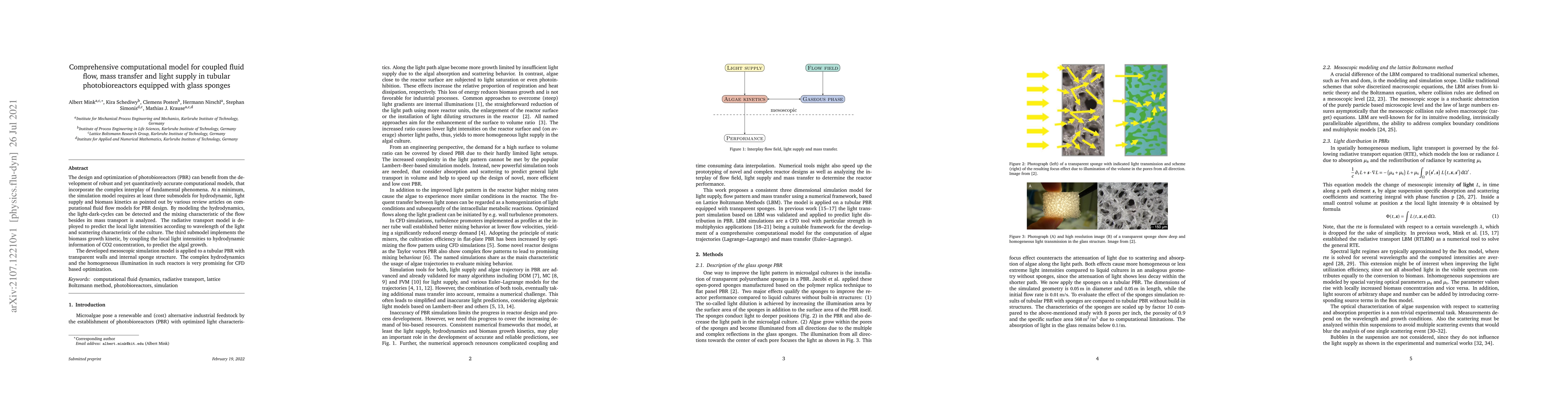 The design and optimization of photobioreactors (PBR) can benefit from the development of robust and yet quantitatively accurate computational models, that incorporate the complex interplay of fundamental phenomena. At a minimum, the simulation model requires at least three submodels for hydrodynamic, light supply and biomass kinetics as pointed out by various review articles on computational fluid flow models for PBR design. By modeling the hydrodynamics, the light-dark-cycles can be detected and the mixing characteristic of the flow besides its mass transport is analyzed. The radiative transport model is deployed to predict the local light intensities according to wavelength of the light and scattering characteristic of the culture. The third submodel implements the biomass growth kinetic, by coupling the local light intensities to hydrodynamic information of CO2 concentration, to predict the algal growth. The developed mesoscopic simulation model is applied to a tubular PBR with transparent walls and internal sponge structure. The complex hydrodynamics and the homogeneous illumination in such reactors is very promising for CFD based optimization.
