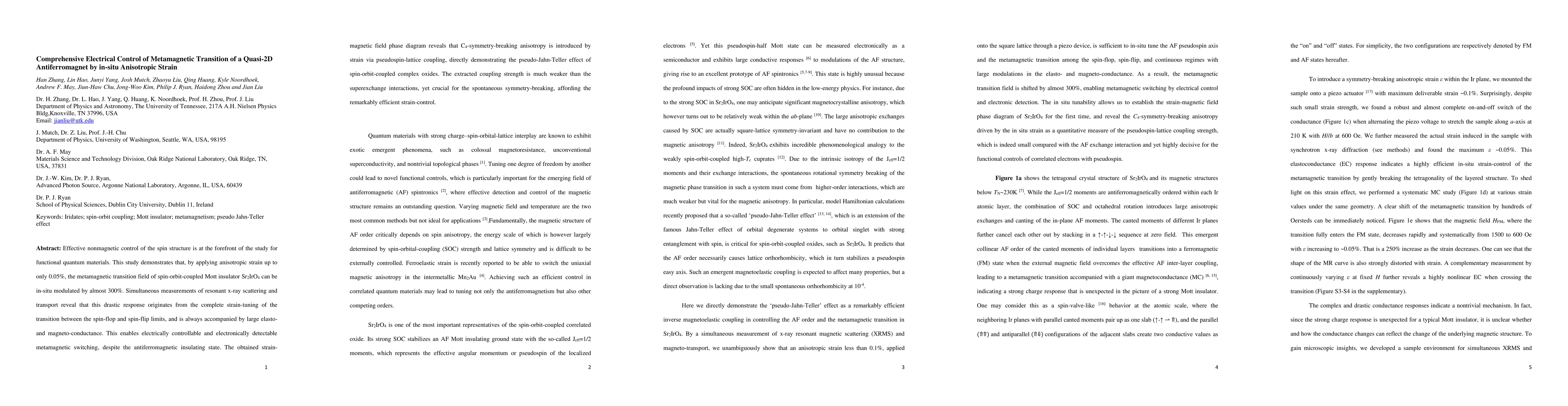 This study demonstrates that a 0.05% anisotropic strain can modulate the metamagnetic critical field of Sr2IrO4 by over 50%, enabling electrical control of its metamagnetic transition, with the transition type tuned from spin-flop to spin-flip due to symmetry-breaking magnetic anisotropy.