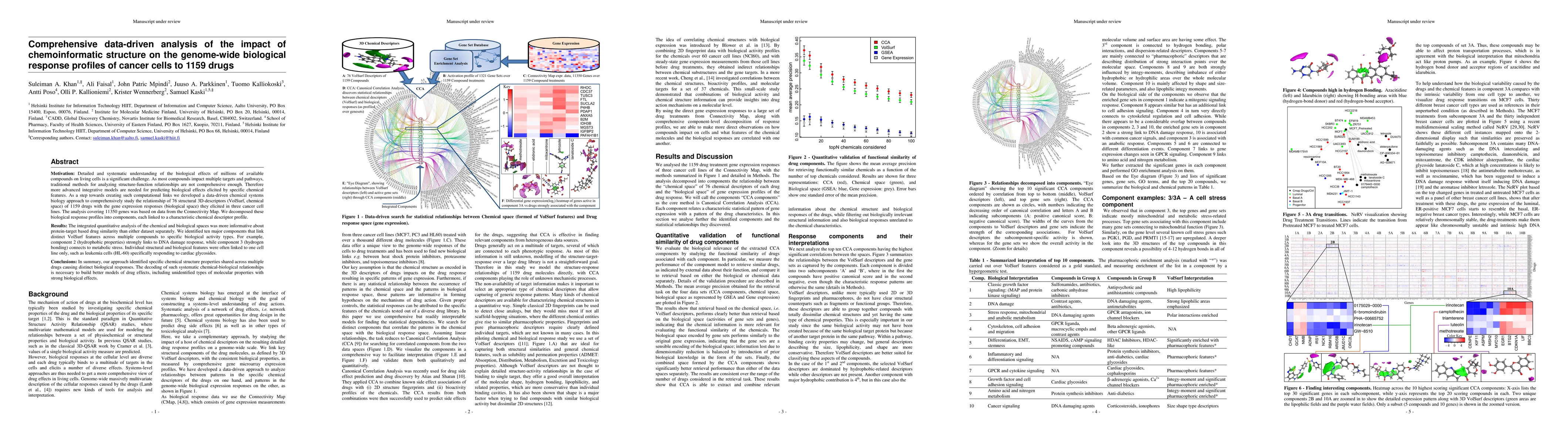 Detailed and systematic understanding of the biological effects of millions of available compounds on living cells is a significant challenge. As most compounds impact multiple targets and pathways, traditional methods for analyzing structure-function relationships are not comprehensive enough. Therefore more advanced integrative models are needed for predicting biological effects elicited by specific chemical features. As a step towards creating such computational links we developed a data-driven chemical systems biology approach to comprehensively study the relationship of 76 structural 3D-descriptors (VolSurf, chemical space) of 1159 drugs with the gene expression responses (biological space) they elicited in three cancer cell lines. The analysis covering 11350 genes was based on data from the Connectivity Map. We decomposed these biological response profiles into components, each linked to a characteristic chemical descriptor profile. The integrated quantitative analysis of the chemical and biological spaces was more informative about protein-target based drug similarity than either dataset separately. We identified ten major components that link distinct VolSurf features across multiple compounds to specific biological activity types. For example, component 2 (hydrophobic properties) strongly links to DNA damage response, while component 3 (hydrogen bonding) connects to metabolic stress. Individual structural and biological features were often linked to one cell line only, such as leukemia cells (HL-60) specifically responding to cardiac glycosides. In summary, our approach identified specific chemical structures shared across multiple drugs causing distinct biological responses. The decoding of such systematic chemical-biological relationships is necessary to build better models of drug effects, including unidentified types of molecular properties with strong biological effects.