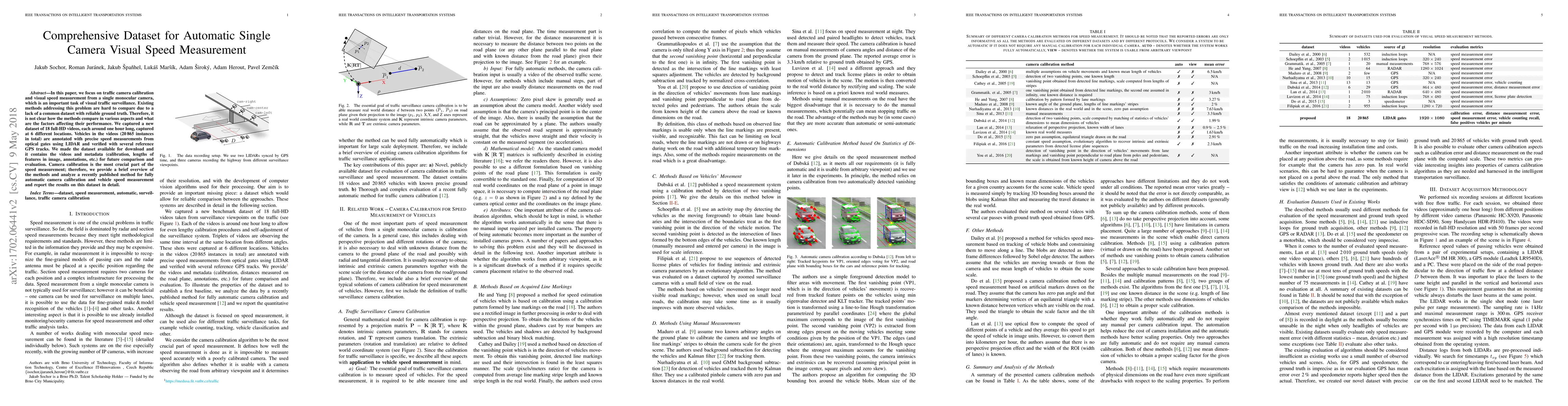 In this paper, we focus on traffic camera calibration and a visual speed measurement from a single monocular camera, which is an important task of visual traffic surveillance. Existing methods addressing this problem are difficult to compare due to a lack of a common data set with reliable ground truth. Therefore, it is not clear how the methods compare in various aspects and what factors are affecting their performance. We captured a new data set of 18 full-HD videos, each around 1 hr long, captured at six different locations. Vehicles in the videos (20865 instances in total) are annotated with the precise speed measurements from optical gates using LiDAR and verified with several reference GPS tracks. We made the data set available for download and it contains the videos and metadata (calibration, lengths of features in image, annotations, and so on) for future comparison and evaluation. Camera calibration is the most crucial part of the speed measurement; therefore, we provide a brief overview of the methods and analyze a recently published method for fully automatic camera calibration and vehicle speed measurement and report the results on this data set in detail.