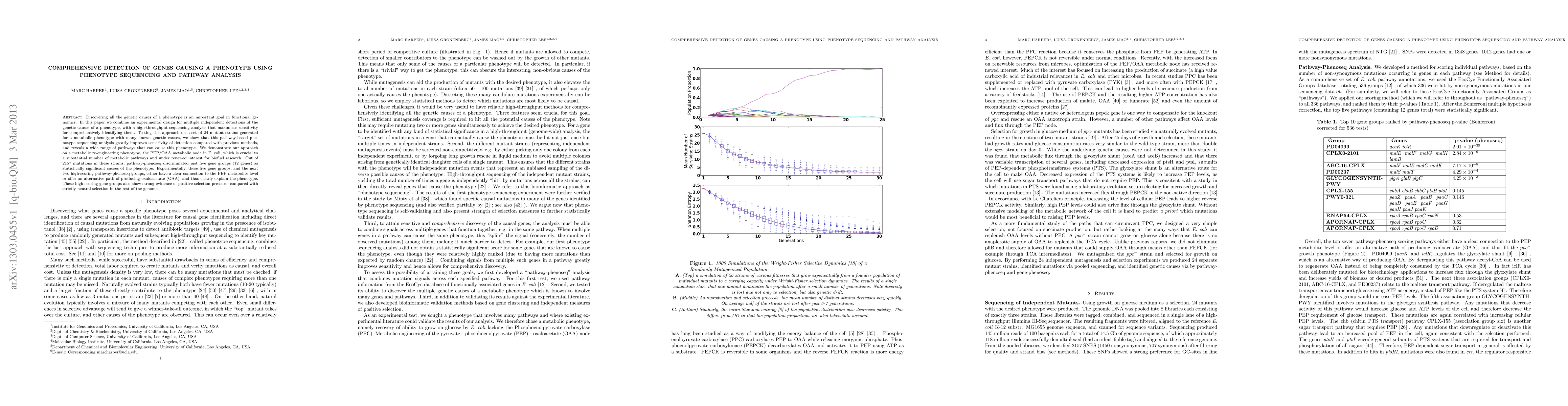 This paper combines phenotype sequencing with pathway analysis to detect genetic causes of a metabolic phenotype in E. coli, significantly improving detection sensitivity and revealing multiple pathways. The approach identifies five gene groups as the primary causes, which are linked to the PEP/OAA metabolic node and show evidence of positive selection.