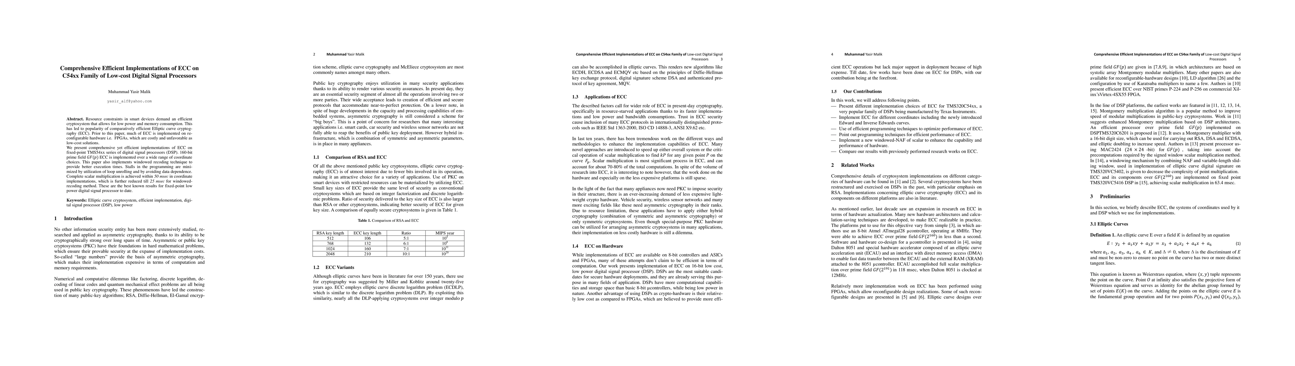 Resource constraints in smart devices demand an efficient cryptosystem that allows for low power and memory consumption. This has led to popularity of comparatively efficient Elliptic curve cryptog-raphy (ECC). Prior to this paper, much of ECC is implemented on re-configurable hardware i.e. FPGAs, which are costly and unfavorable as low-cost solutions. We present comprehensive yet efficient implementations of ECC on fixed-point TMS54xx series of digital signal processors (DSP). 160-bit prime field GF(p) ECC is implemented over a wide range of coordinate choices. This paper also implements windowed recoding technique to provide better execution times. Stalls in the programming are mini-mized by utilization of loop unrolling and by avoiding data dependence. Complete scalar multiplication is achieved within 50 msec in coordinate implementations, which is further reduced till 25 msec for windowed-recoding method. These are the best known results for fixed-point low power digital signal processor to date.