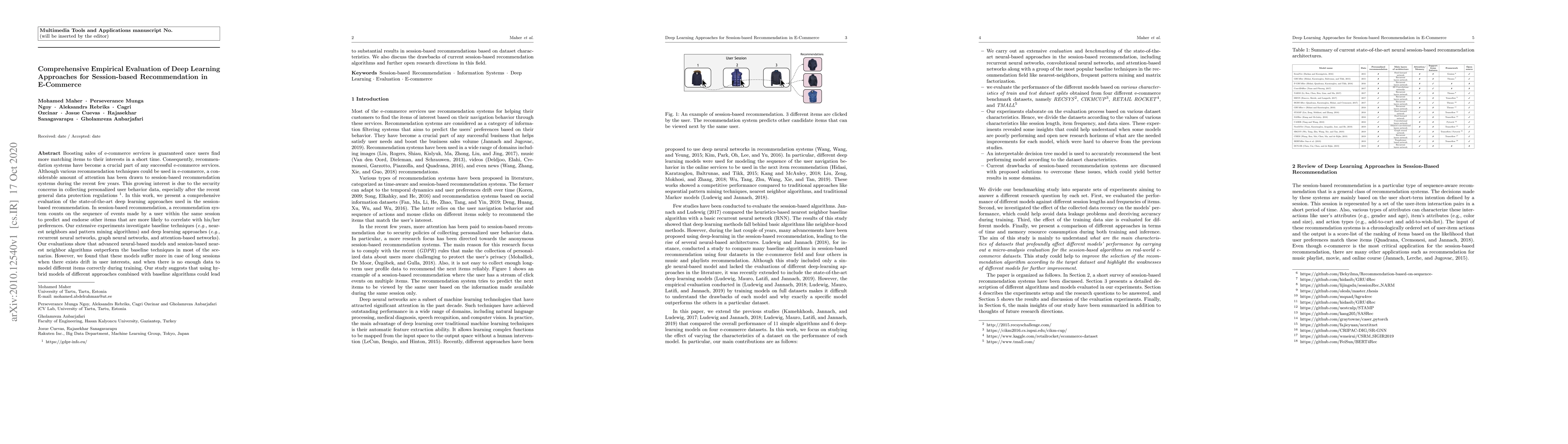 This paper evaluates state-of-the-art deep learning methods for session-based recommendation in e-commerce, showing that advanced neural models and session-based nearest neighbor algorithms outperform traditional baselines. However, these models struggle with long sessions and data scarcity, suggesting hybrid approaches could yield better results depending on dataset characteristics.