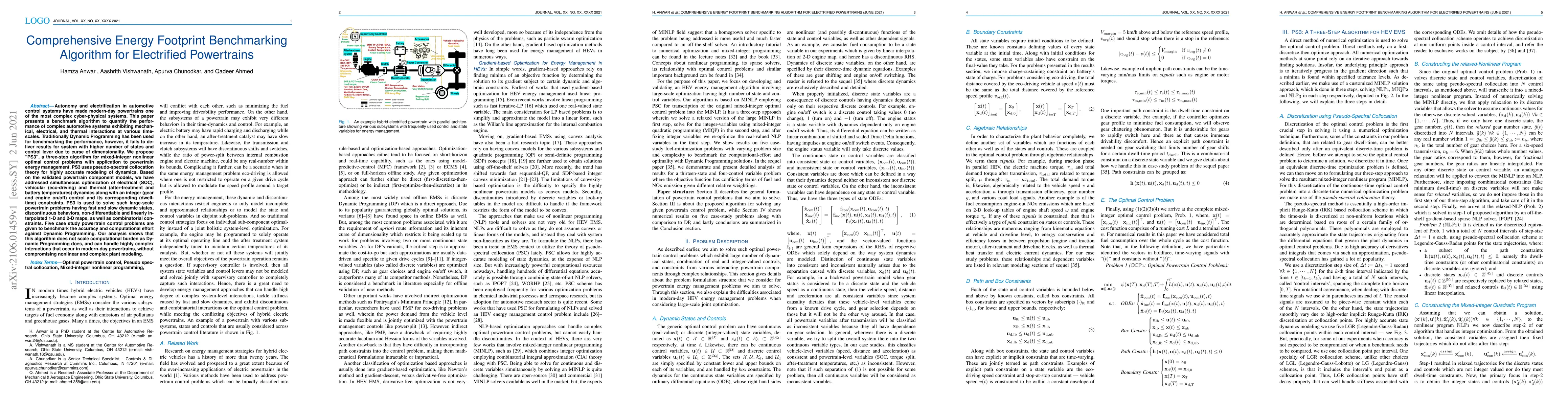 This paper introduces a new benchmarking algorithm, PS3, for evaluating the performance of electrified automotive powertrains, addressing the limitations of Dynamic Programming in handling high-dimensional systems. PS3 employs pseudo-spectral collocation theory for accurate modeling and optimizes electrical, vehicular, and thermal dynamics with combinatorial constraints.