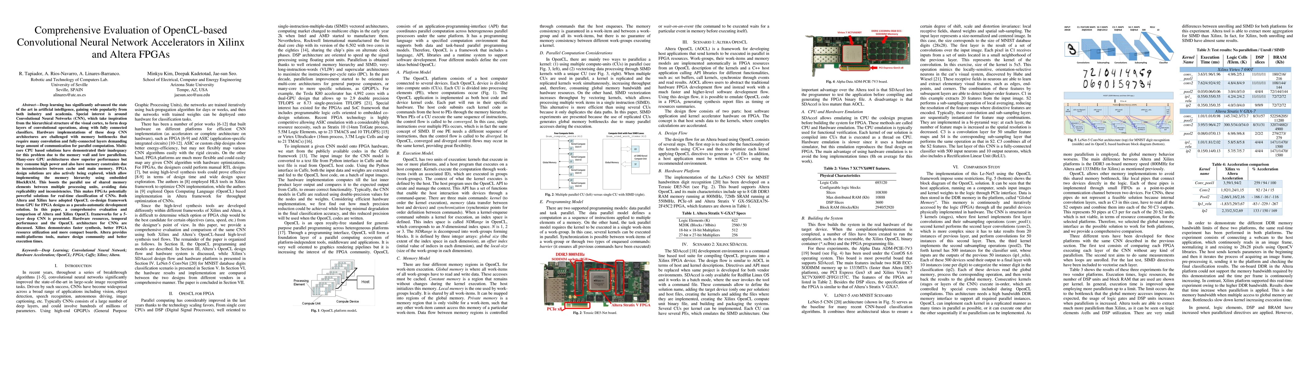 This research paper evaluates and compares the performance of Convolutional Neural Network (CNN) accelerators implemented using OpenCL on Xilinx and Altera FPGAs. It highlights the advantages and disadvantages of both platforms in addressing the memory bottlenecks and parallel computation challenges in deep CNN architectures. The study concludes that Xilinx offers better FPGA resource utilization and faster synthesis, while Altera provides more robust tools and a mature design community. For detailed insights, readers are encouraged to refer to the full paper.