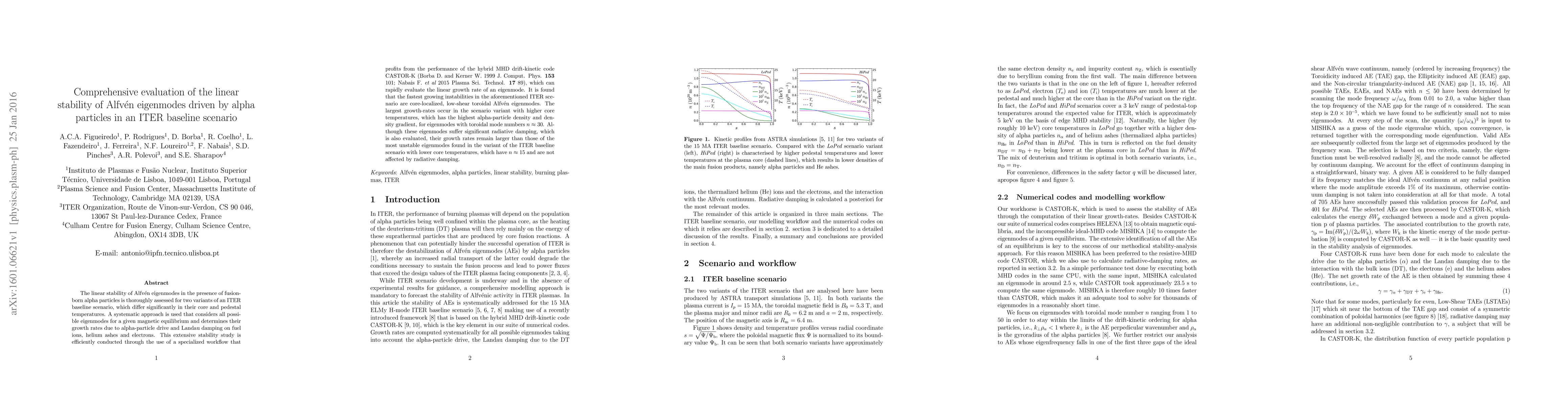 The linear stability of Alfv\'en eigenmodes in the presence of fusion-born alpha particles is thoroughly assessed for two variants of an ITER baseline scenario, which differ significantly in their core and pedestal temperatures. A systematic approach is used that considers all possible eigenmodes for a given magnetic equilibrium and determines their growth rates due to alpha-particle drive and Landau damping on fuel ions, helium ashes and electrons. This extensive stability study is efficiently conducted through the use of a specialized workflow that profits from the performance of the hybrid MHD drift-kinetic code $\mbox{CASTOR-K}$ (Borba D. and Kerner W. 1999 J. Comput. Phys. ${\bf 153}$ 101; Nabais F. ${\it et\,al}$ 2015 Plasma Sci. Technol. ${\bf 17}$ 89), which can rapidly evaluate the linear growth rate of an eigenmode. It is found that the fastest growing instabilities in the aforementioned ITER scenario are core-localized, low-shear toroidal Alfv\'en eigenmodes. The largest growth-rates occur in the scenario variant with higher core temperatures, which has the highest alpha-particle density and density gradient, for eigenmodes with toroidal mode numbers $n\approx30$. Although these eigenmodes suffer significant radiative damping, which is also evaluated, their growth rates remain larger than those of the most unstable eigenmodes found in the variant of the ITER baseline scenario with lower core temperatures, which have $n\approx15$ and are not affected by radiative damping.