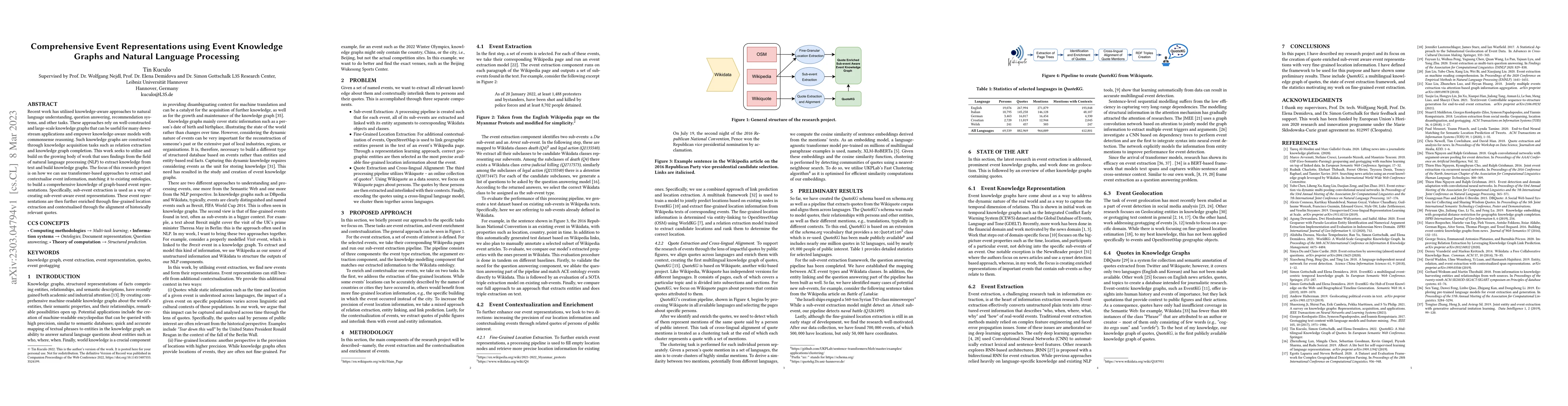 This paper explores transformer-based NLP methods to extract and contextualize event information from text, using sub-event extraction and location details to build comprehensive knowledge graphs. It aims to enrich event representations through historically relevant quotes alignment, enhancing commonsense reasoning.