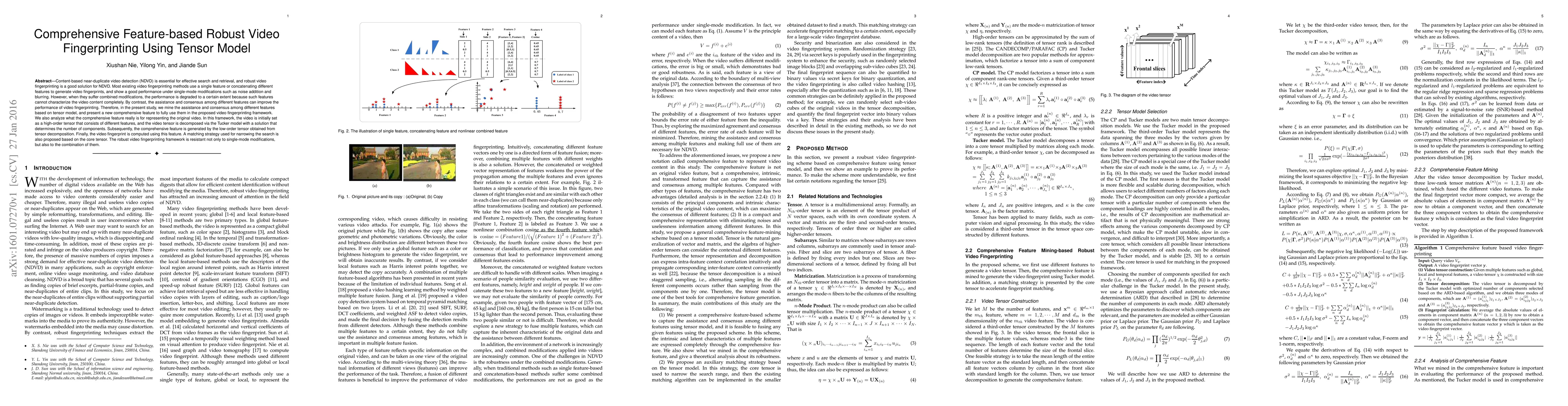 Content-based near-duplicate video detection (NDVD) is essential for effective search and retrieval, and robust video fingerprinting is a good solution for NDVD. Most existing video fingerprinting methods use a single feature or concatenating different features to generate video fingerprints, and show a good performance under single-mode modifications such as noise addition and blurring. However, when they suffer combined modifications, the performance is degraded to a certain extent because such features cannot characterize the video content completely. By contrast, the assistance and consensus among different features can improve the performance of video fingerprinting. Therefore, in the present study, we mine the assistance and consensus among different features based on tensor model, and present a new comprehensive feature to fully use them in the proposed video fingerprinting framework. We also analyze what the comprehensive feature really is for representing the original video. In this framework, the video is initially set as a high-order tensor that consists of different features, and the video tensor is decomposed via the Tucker model with a solution that determines the number of components. Subsequently, the comprehensive feature is generated by the low-order tensor obtained from tensor decomposition. Finally, the video fingerprint is computed using this feature. A matching strategy used for narrowing the search is also proposed based on the core tensor. The robust video fingerprinting framework is resistant not only to single-mode modifications, but also to the combination of them.