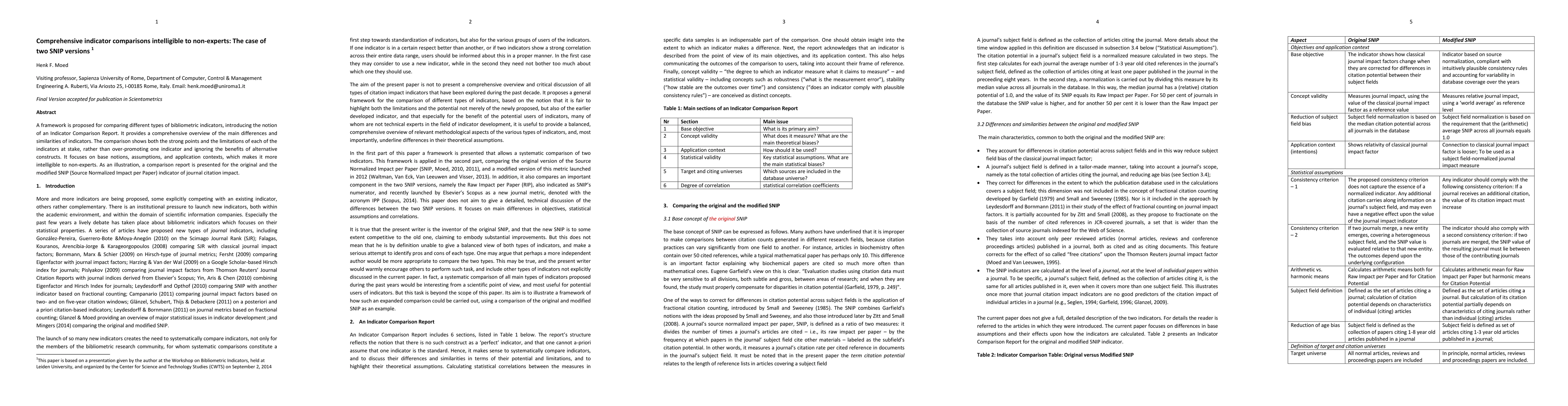 This paper proposes a framework for comparing bibliometric indicators, introducing an Indicator Comparison Report that elucidates the strengths and limitations of different indicators. It specifically compares the original and modified versions of the SNIP citation impact indicator, making it accessible to non-experts by focusing on base notions and application contexts.