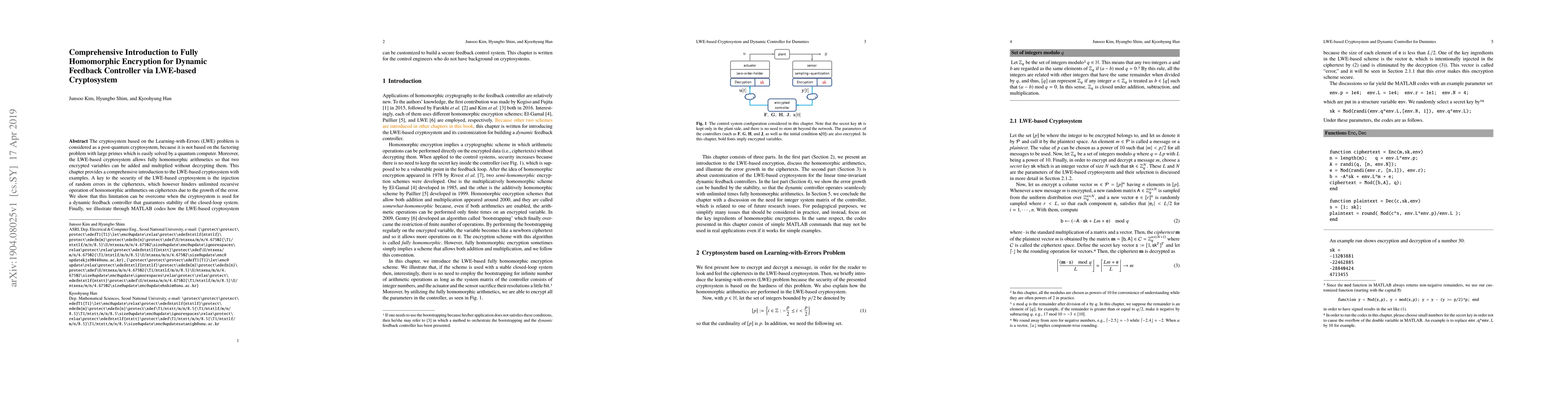 The cryptosystem based on the Learning-with-Errors (LWE) problem is considered as a post-quantum cryptosystem, because it is not based on the factoring problem with large primes which is easily solved by a quantum computer. Moreover, the LWE-based cryptosystem allows fully homomorphic arithmetics so that two encrypted variables can be added and multiplied without decrypting them. This chapter provides a comprehensive introduction to the LWE-based cryptosystem with examples. A key to the security of the LWE-based cryptosystem is the injection of random errors in the ciphertexts, which however hinders unlimited recursive operation of homomorphic arithmetics on ciphertexts due to the growth of the error. We show that this limitation can be overcome when the cryptosystem is used for a dynamic feedback controller that guarantees stability of the closed-loop system. Finally, we illustrate through MATLAB codes how the LWE-based cryptosystem can be customized to build a secure feedback control system. This chapter is written for the control engineers who do not have background on cryptosystems.