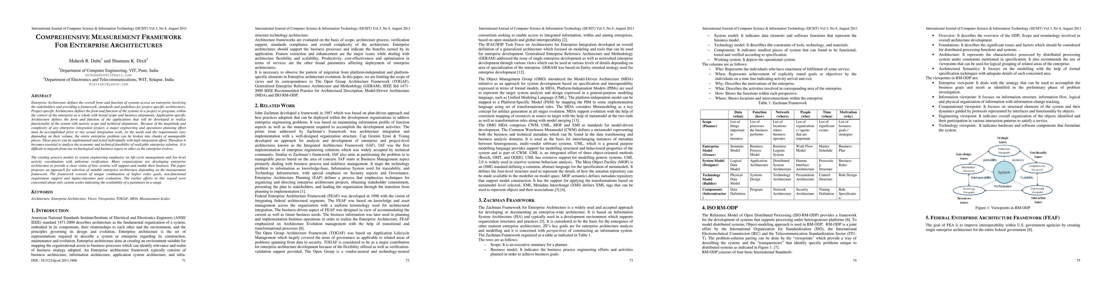 Enterprise Architecture defines the overall form and function of systems across an enterprise involving the stakeholders and providing a framework, standards and guidelines for project-specific architectures. Project-specific Architecture defines the form and function of the systems in a project or program, within the context of the enterprise as a whole with broad scope and business alignments. Application-specific Architecture defines the form and function of the applications that will be developed to realize functionality of the system with narrow scope and technical alignments. Because of the magnitude and complexity of any enterprise integration project, a major engineering and operations planning effort must be accomplished prior to any actual integration work. As the needs and the requirements vary depending on their volume, the entire enterprise problem can be broken into chunks of manageable pieces. These pieces can be implemented and tested individually with high integration effort. Therefore it becomes essential to analyze the economic and technical feasibility of realizable enterprise solution. It is difficult to migrate from one technological and business aspect to other as the enterprise evolves. The existing process models in system engineering emphasize on life-cycle management and low-level activity coordination with milestone verification. Many organizations are developing enterprise architecture to provide a clear vision of how systems will support and enable their business. The paper proposes an approach for selection of suitable enterprise architecture depending on the measurement framework. The framework consists of unique combination of higher order goals, non-functional requirement support and inputs-outcomes pair evaluation. The earlier efforts in this regard were concerned about only custom scales indicating the availability of a parameter in a range.