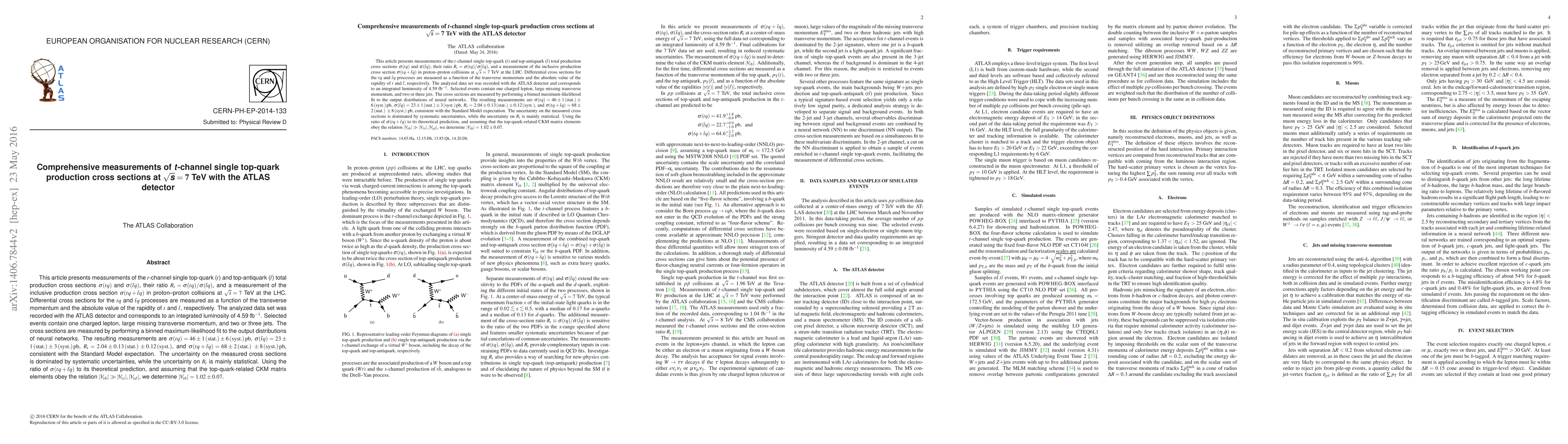 This paper reports measurements of $t$-channel single top-quark production cross sections at $\sqrt{s} = 7$ TeV using the ATLAS detector, finding $\sigma(tq)= 46\pm 6\; \mathrm{pb}$ and $\sigma(\bar{t}q)= 23 \pm 4\; \mathrm{pb}$, consistent with Standard Model predictions.