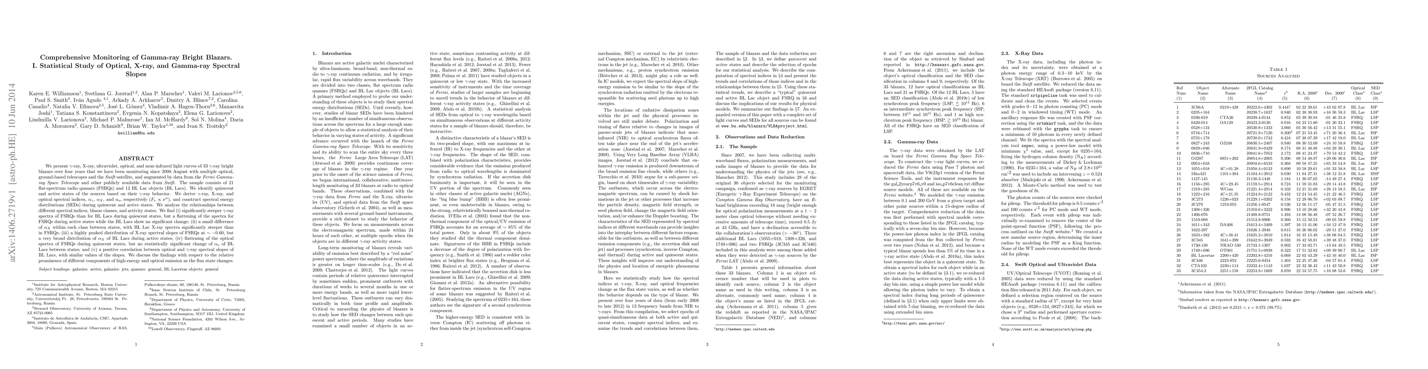 We present $\gamma$-ray, X-ray, ultraviolet, optical, and near-infrared light curves of 33 $\gamma$-ray bright blazars over four years that we have been monitoring since 2008 August with multiple optical, ground-based telescopes and the Swift satellite, and augmented by data from the Fermi Gamma-ray Space Telescope and other publicly available data from Swift. The sample consists of 21 flat-spectrum radio quasars (FSRQs) and 12 BL Lac objects (BL Lacs). We identify quiescent and active states of the sources based on their $\gamma$-ray behavior. We derive $\gamma$-ray, X-ray, and optical spectral indices, $\alpha_\gamma$, $\alpha_X$, and $\alpha_o$, respectively ($F_\nu\propto\nu^\alpha$), and construct spectral energy distributions (SEDs) during quiescent and active states. We analyze the relationships between different spectral indices, blazar classes, and activity states. We find (i) significantly steeper $\gamma$-ray spectra of FSRQs than for BL Lacs during quiescent states, but a flattening of the spectra for FSRQs during active states while the BL Lacs show no significant change; (ii) a small difference of $\alpha_X$ within each class between states, with BL Lac X-ray spectra significantly steeper than in FSRQs; (iii) a highly peaked distribution of X-ray spectral slopes of FSRQs at $\sim-$0.60, but a very broad distribution of $\alpha_X$ of BL Lacs during active states; (iv) flattening of the optical spectra of FSRQs during quiescent states, but no statistically significant change of $\alpha_o$ of BL Lacs between states; and (v) a positive correlation between optical and $\gamma$-ray spectral slopes of BL Lacs, with similar values of the slopes. We discuss the findings with respect to the relative prominence of different components of high-energy and optical emission as the flux state changes.