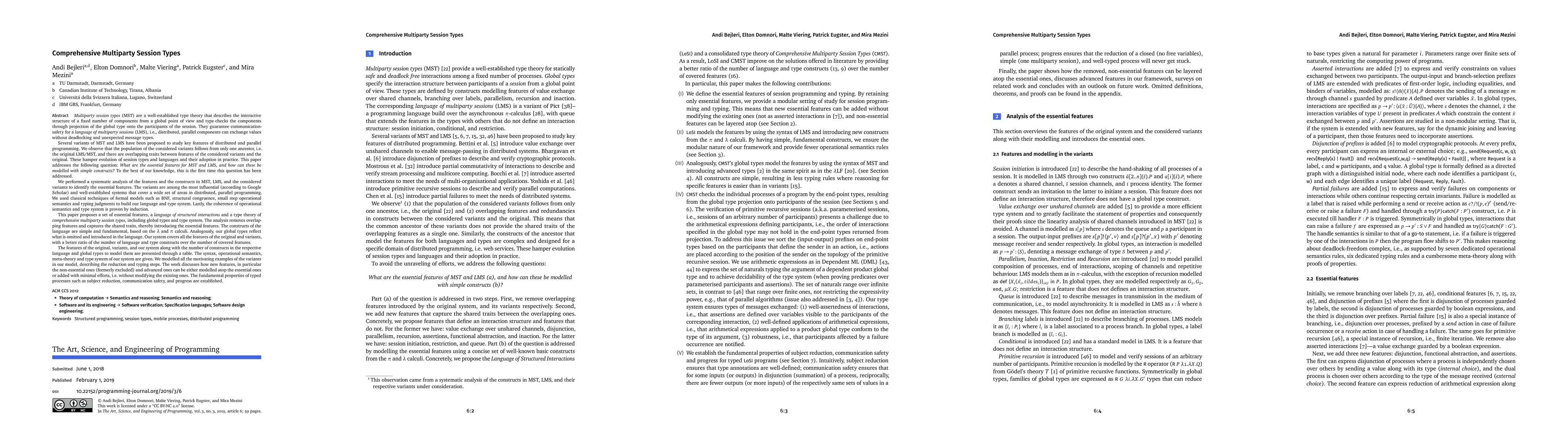 Multiparty session types (MST) are a well-established type theory that describes the interactive structure of a fixed number of components from a global point of view and type-checks the components through projection of the global type onto the participants of the session. They guarantee communicationsafety for a language of multiparty sessions (LMS), i.e., distributed, parallel components can exchange values without deadlocking and unexpected message types. Several variants of MST and LMS have been proposed to study key features of distributed and parallel programming. We observe that the population of the considered variants follows from only one ancestor, i.e., the original LMS/MST, and there are overlapping traits between features of the considered variants and the original. These hamper evolution of session types and languages and their adoption in practice. This paper addresses the following question: What are the essential features for MST and LMS, and how can these be modelled with simple constructs? To the best of our knowledge, this is the first time this question has been addressed. We performed a systematic analysis of the features and the constructs in MST, LMS, and the considered variants to identify the essential features. The variants are among the most influential (according to Google Scholar) and well-established systems that cover a wide set of areas in distributed, parallel programming. We used classical techniques of formal models such as BNF, structural congruence, small step operational semantics and typing judgments to build our language and type system. Lastly, the coherence of operational semantics and type system is proven by induction. This paper proposes a set of essential features, a language of structured interactions and a type theory of comprehensive multiparty session types, including global types and type system. The analysis removes overlapping features and captures the shared traits, thereby introducing the essential features. The constructs of the language are simple and fundamental, based on the $\lambda$ and $\pi$ calculi. Analogously, our global types reflect what is omitted and introduced in the language. Our system covers all the features of the original and variants, with a better ratio of the number of language and type constructs over the number of covered features. The features of the original, variants, and our system along with the number of constructs in the respective language and global types to model them are presented through a table. The syntax, operational semantics, meta-theory and type system of our system are given. We modelled all the motivating examples of the variants in our model, describing the reduction and typing steps. The work discusses how new features, in particular the non-essential ones (formerly excluded) and advanced ones can be either modelled atop the essential ones or added with minimal efforts, i.e. without modifying the existing ones. The fundamental properties of typed processes such as subject reduction, communication safety, and progress are established.