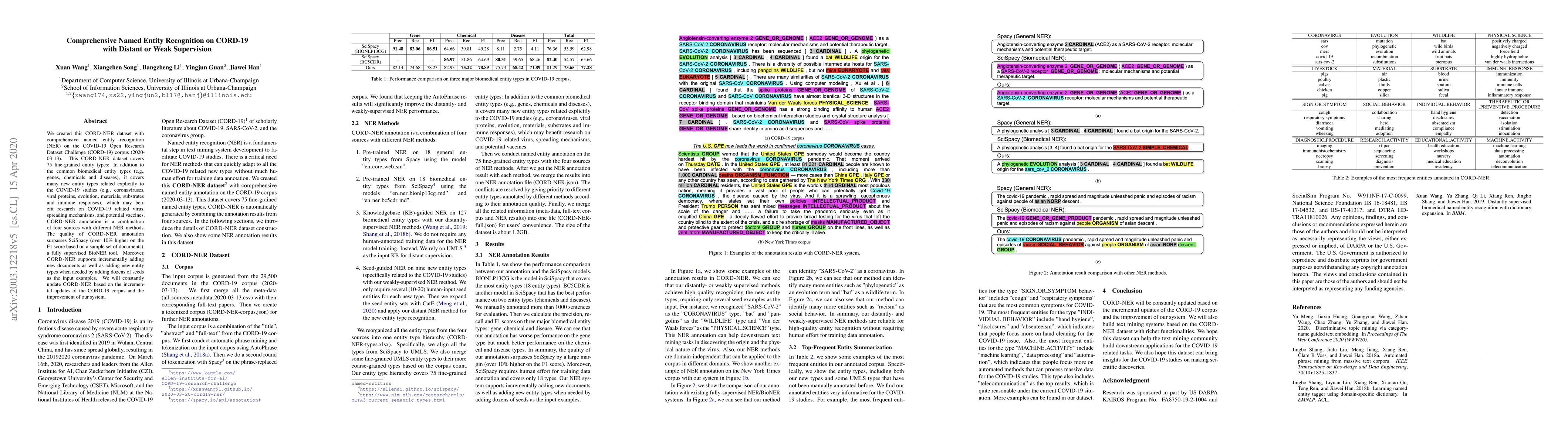 We created this CORD-NER dataset with comprehensive named entity recognition (NER) on the COVID-19 Open Research Dataset Challenge (CORD-19) corpus (2020-03-13). This CORD-NER dataset covers 75 fine-grained entity types: In addition to the common biomedical entity types (e.g., genes, chemicals and diseases), it covers many new entity types related explicitly to the COVID-19 studies (e.g., coronaviruses, viral proteins, evolution, materials, substrates and immune responses), which may benefit research on COVID-19 related virus, spreading mechanisms, and potential vaccines. CORD-NER annotation is a combination of four sources with different NER methods. The quality of CORD-NER annotation surpasses SciSpacy (over 10% higher on the F1 score based on a sample set of documents), a fully supervised BioNER tool. Moreover, CORD-NER supports incrementally adding new documents as well as adding new entity types when needed by adding dozens of seeds as the input examples. We will constantly update CORD-NER based on the incremental updates of the CORD-19 corpus and the improvement of our system.