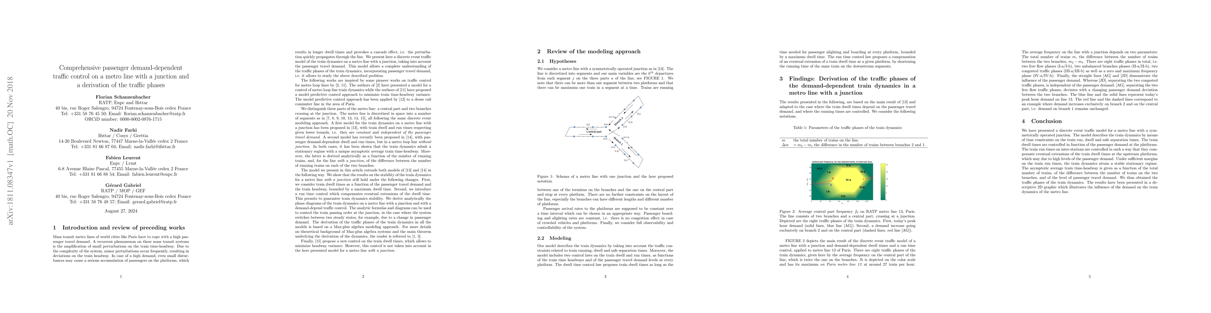 This paper is an extended abstract on a traffic model for the train dynamics on a metro line with a junction. The dynamic model includes control laws on the dwell and on the run time, taking into account the passenger travel demand. Our model extends two existing traffic models: 1. a model that describes the train dynamics on a metro line with a junction but without taking into account the travel demand, i.e. dwell and run times are fixed, and 2. another model that controls the train dynamics on a linear metro line (without junction) taking into account the passenger travel demand. We present the phase diagram of the train dynamics in the metro line with a junction. Train time-headway and frequency are functions of 1. the number of trains on the line, 2. the difference between the number of trains on the two branches, and 3. the passenger demand level. The derived diagram can be used for the optimization of the traffic control on the metro line and at the junction.