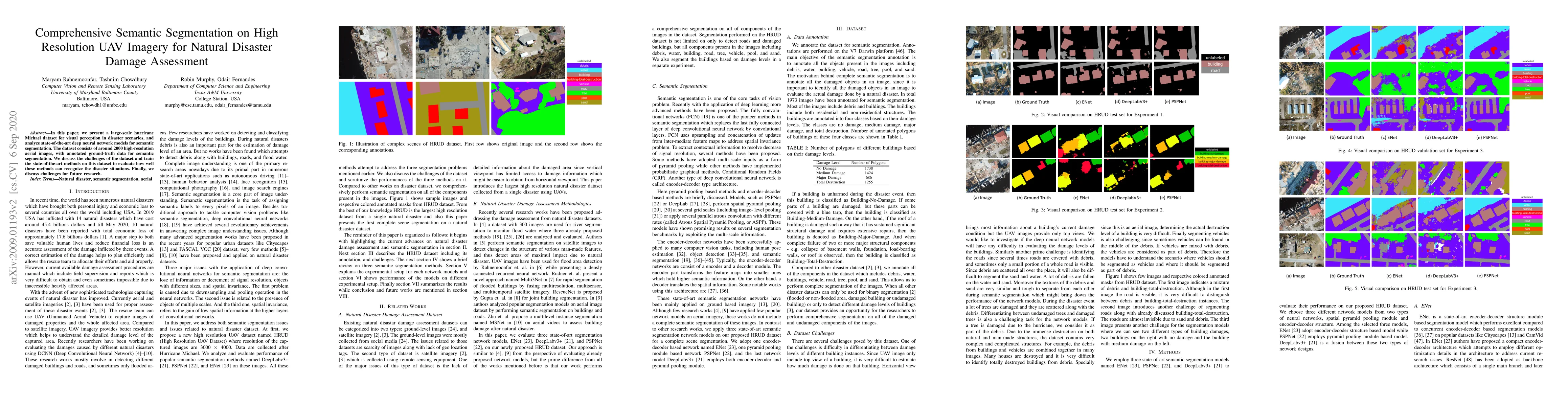 This paper introduces a large-scale dataset of high-resolution UAV imagery from Hurricane Michael for natural disaster damage assessment, and evaluates state-of-the-art deep learning models for semantic segmentation on this dataset, highlighting challenges and future research directions.