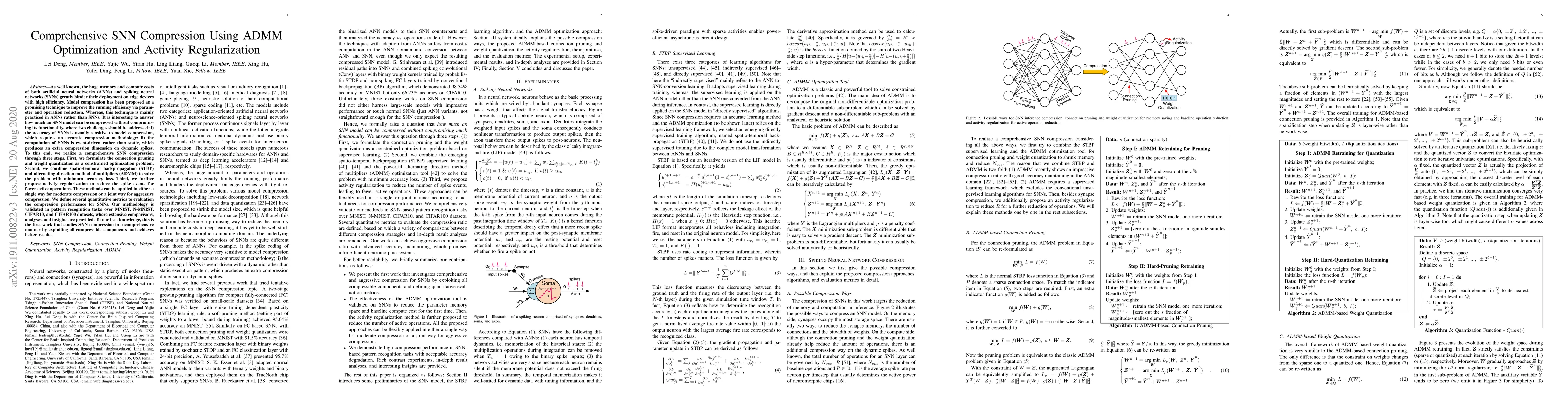 As well known, the huge memory and compute costs of both artificial neural networks (ANNs) and spiking neural networks (SNNs) greatly hinder their deployment on edge devices with high efficiency. Model compression has been proposed as a promising technique to improve the running efficiency via parameter and operation reduction. Whereas, this technique is mainly practiced in ANNs rather than SNNs. It is interesting to answer how much an SNN model can be compressed without compromising its functionality, where two challenges should be addressed: i) the accuracy of SNNs is usually sensitive to model compression, which requires an accurate compression methodology; ii) the computation of SNNs is event-driven rather than static, which produces an extra compression dimension on dynamic spikes. To this end, we realize a comprehensive SNN compression through three steps. First, we formulate the connection pruning and weight quantization as a constrained optimization problem. Second, we combine spatio-temporal backpropagation (STBP) and alternating direction method of multipliers (ADMM) to solve the problem with minimum accuracy loss. Third, we further propose activity regularization to reduce the spike events for fewer active operations. These methods can be applied in either a single way for moderate compression or a joint way for aggressive compression. We define several quantitative metrics to evaluation the compression performance for SNNs. Our methodology is validated in pattern recognition tasks over MNIST, N-MNIST, CIFAR10, and CIFAR100 datasets, where extensive comparisons, analyses, and insights are provided. To our best knowledge, this is the first work that studies SNN compression in a comprehensive manner by exploiting all compressible components and achieves better results.