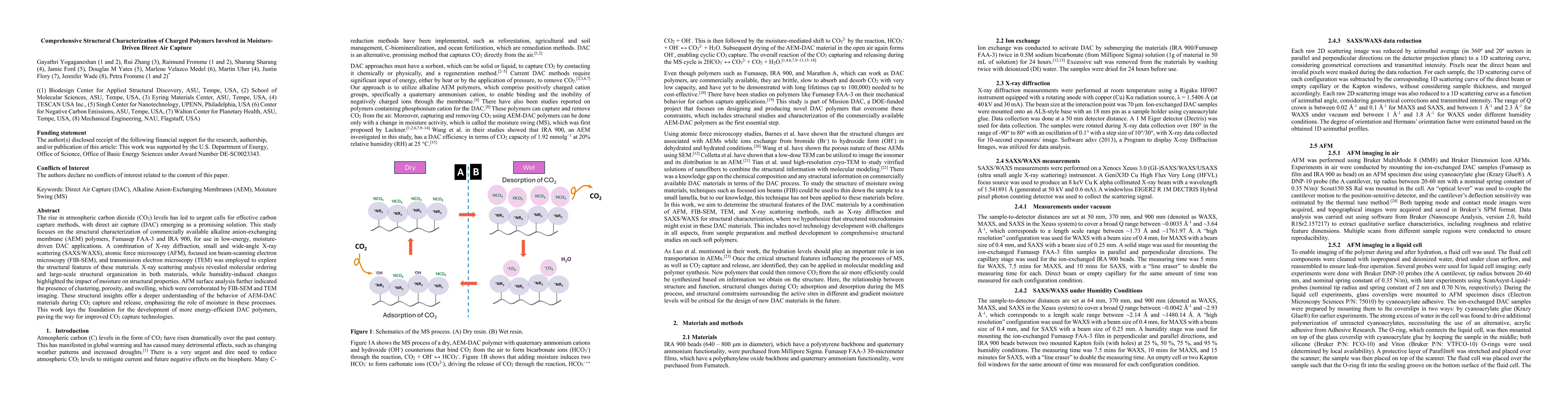 The rise in atmospheric carbon dioxide (CO2) levels has led to urgent calls for effective carbon capture methods, with direct air capture (DAC) emerging as a promising solution. This study focuses on the structural characterization of commercially available alkaline anion-exchange membrane (AEM) polymers, Fumasep FAA-3 and IRA 900, for use in low-energy, moisture-driven DAC applications. A combination of X-ray diffraction, small and wide-angle X-ray scattering (SAXS/WAXS), atomic force microscopy (AFM), focused ion beam-scanning electron microscopy (FIB-SEM), and transmission electron microscopy (TEM) were employed to explore the structural features of these materials. X-ray scattering analysis revealed molecular ordering and large-scale structural organization in both materials, while humidity-induced changes highlighted the impact of moisture on structural properties. AFM surface analysis further indicated the presence of clustering, porosity, and swelling, which were corroborated by FIB-SEM and TEM imaging. These structural insights offer a deeper understanding of the behavior of AEM-DAC materials during CO2 capture and release, emphasizing the role of moisture in these processes. This work lays the foundation for the development of more energy-efficient DAC polymers, paving the way for improved CO2 capture technologies.