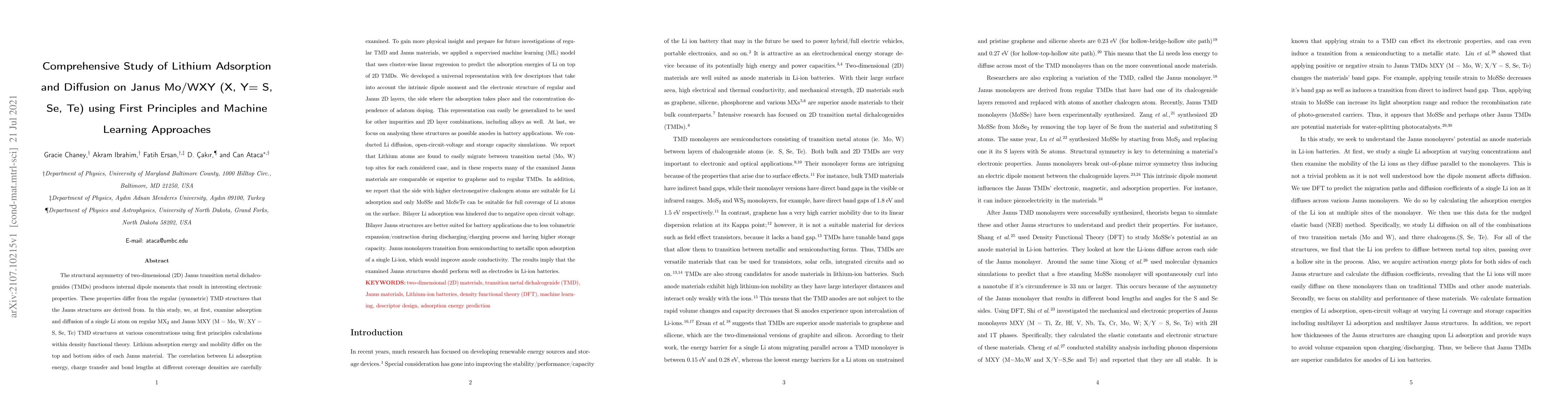 The structural asymmetry of two-dimensional (2D) Janus transition metal dichalcogenides (TMDs) produces internal dipole moments that result in interesting electronic properties. These properties differ from the regular (symmetric) TMD structures that the Janus structures are derived from. In this study, we, at first, examine adsorption and diffusion of a single Li atom on regular MX2and Janus MXY (M = Mo, W; XY =S, Se, Te) TMD structures at various concentrations using first principles calculations within density functional theory. To gain more physical insight and prepare for future investigations of regular TMD and Janus materials, we applied a supervised machine learning (ML) model that uses cluster-wise linear regression to predict the adsorption energies of Li on top of 2D TMDs. We developed a universal representation with few descriptors that take into account the intrinsic dipole moment and the electronic structure of regular and Janus 2D layers, the side where the adsorption takes place and the concentration dependence of adatom doping. This representation can easily be generalized to be used for other impurities and 2D layer combinations, including alloys as well. At last, we focus on analyzing these structures as possible anodes in battery applications. We conducted Li diffusion, open-circuit-voltage and storage capacity simulations. We report that Lithium atoms are found to easily migrate between transition metal (Mo, W) top sites for each considered case, and in these respects many of the examined Janus materials are comparable or superior to graphene and to regular TMDs. The results imply that theexamined Janus structures should perform well as electrodes in Li-ion batteries.