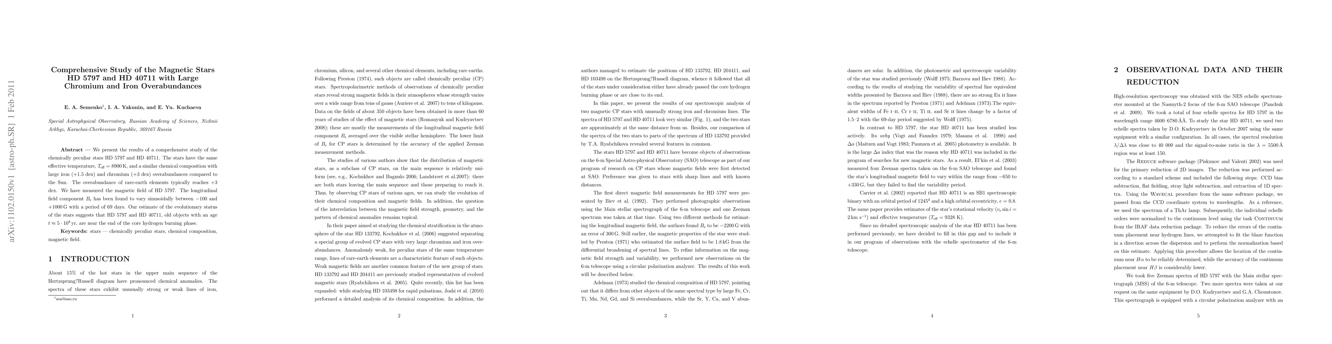We present the results of a comprehensive study of the chemically peculiar stars HD 5797 and HD 40711. The stars have the same effective temperature, Teff = 8900 K, and a similar chemical composition with large iron (+1.5 dex) and chromium (+3 dex) overabundances compared to the Sun. The overabundance of rare-earth elements typically reaches +3 dex. We have measured the magnetic field of HD 5797. The longitudinal field component Be has been found to vary sinusoidally between -100 and +1000 G with a period of 69 days. Our estimate of the evolutionary status of the stars suggests that HD 5797 and HD 40711, old objects with an age t \approx 5 \times 108 yr, are near the end of the core hydrogen burning phase.