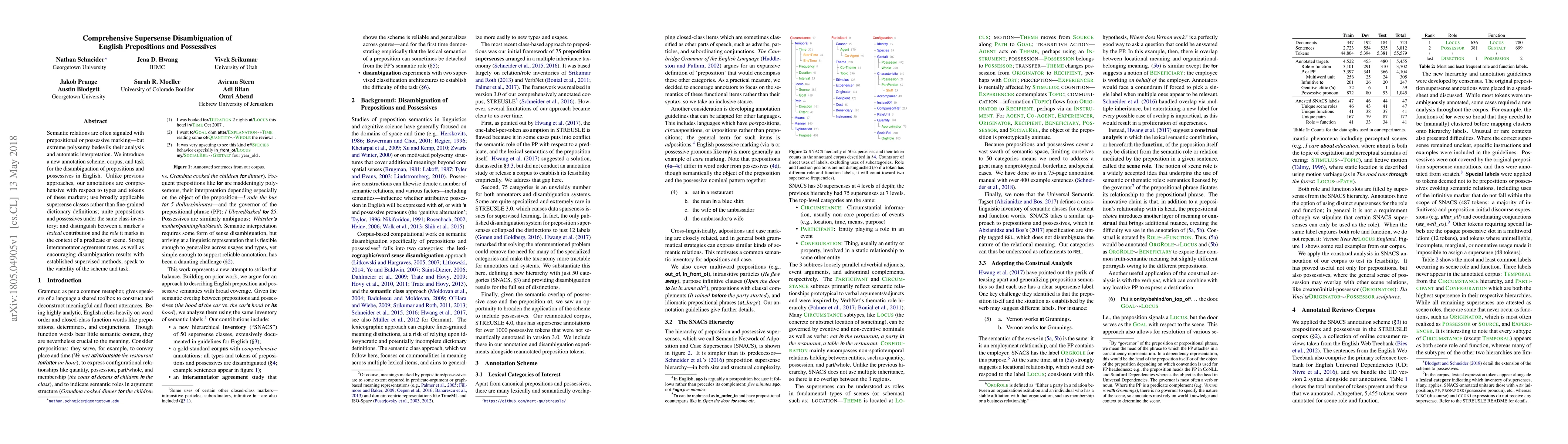 This paper presents a new comprehensive annotation scheme and corpus for disambiguating English prepositions and possessives, using broadly applicable supersense classes. The scheme's strong inter-annotator agreement and successful disambiguation results suggest its effectiveness.