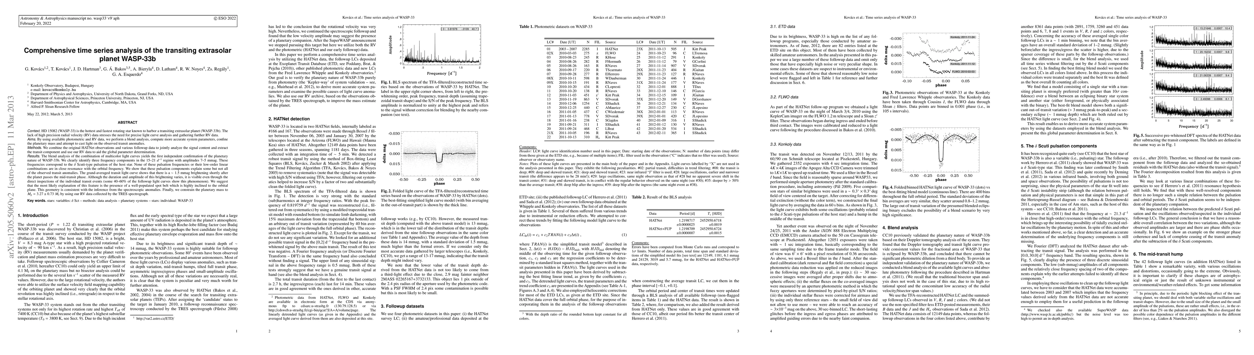 HD 15082 (WASP-33) is the hottest and fastest rotating star known to harbor a transiting extrasolar planet (WASP-33b). The lack of high precision radial velocity (RV) data stresses the need for precise light curve analysis and gathering further RV data. By using available photometric and RV data, we perform a blend analysis, compute more accurate system parameters, confine the planetary mass and attempt to cast light on the observed transit anomalies. We combine the original HATNet observations and various followup data to jointly analyze the signal content and extract the transit component and use our RV data to aid the global parameter determination. The blend analysis of the combination of multicolor light curves yields the first independent confirmation of the planetary nature of WASP-33b. We clearly identify three frequency components in the 15-21 1/day regime with amplitudes 7-5 mmag. These frequencies correspond to the delta Scuti-type pulsation of the host star. None of these pulsation frequencies or their low-order linear combinations are in close resonance with the orbital frequency. We show that these pulsation components explain some but not all of the observed transit anomalies. The grand-averaged transit light curve shows that there is a ~1.5 mmag brightening shortly after the planet passes the mid-transit phase. Although the duration and amplitude of this brightening varies, it is visible even through the direct inspections of the individual transit events (some 40-60% of the followup light curves show this phenomenon). We suggest that the most likely explanation of this feature is the presence of a well-populated spot belt which is highly inclined to the orbital plane. This geometry is consistent with the inference from the spectroscopic anomalies. Finally, we constrain the planetary mass to M_p=3.27+/-0.73 M_J by using our RV data collected by the TRES spectrograph.