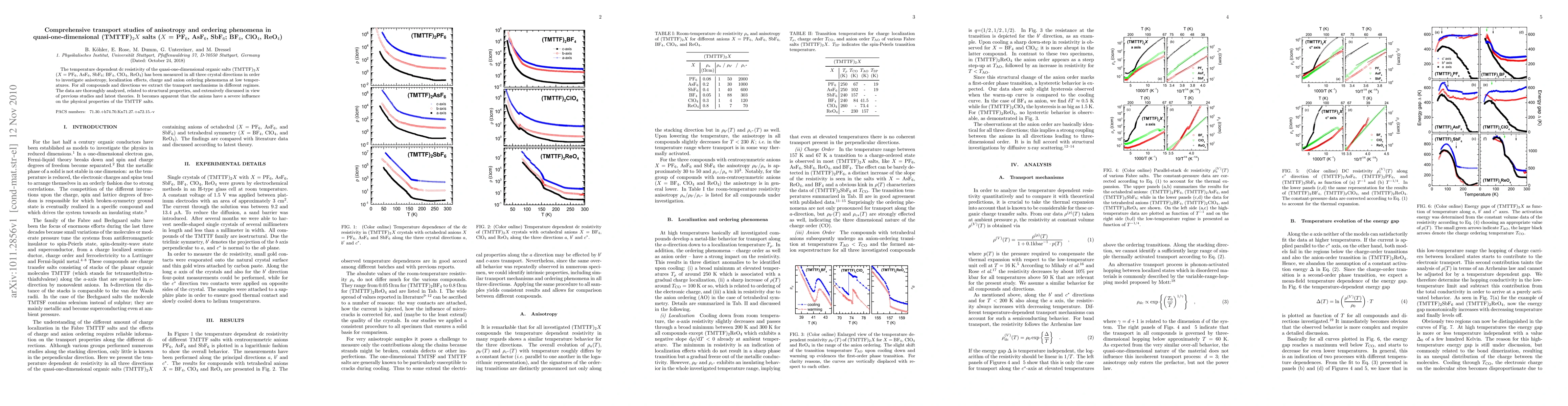 Researchers studied the temperature-dependent resistivity of TMTTF salts in three directions to investigate anisotropy, localization effects, and charge ordering phenomena, finding that anions significantly impact physical properties.