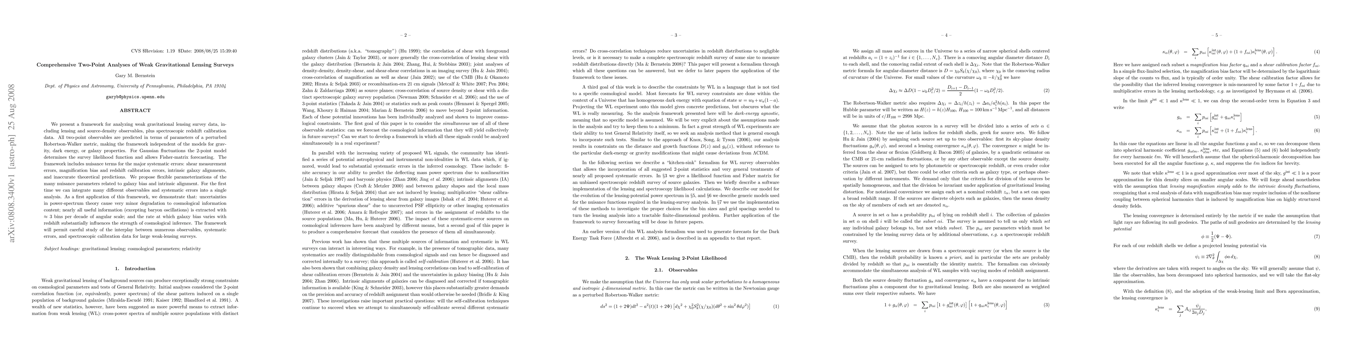 We present a framework for analyzing weak gravitational lensing survey data, including lensing and source-density observables, plus spectroscopic redshift calibration data. All two-point observables are predicted in terms of parameters of a perturbed Robertson-Walker metric, making the framework independent of the models for gravity, dark energy, or galaxy properties. For Gaussian fluctuations the 2-point model determines the survey likelihood function and allows Fisher-matrix forecasting. The framework includes nuisance terms for the major systematic errors: shear measurement errors, magnification bias and redshift calibration errors, intrinsic galaxy alignments, and inaccurate theoretical predictions. We propose flexible parameterizations of the many nuisance parameters related to galaxy bias and intrinsic alignment. For the first time we can integrate many different observables and systematic errors into a single analysis. As a first application of this framework, we demonstrate that: uncertainties in power-spectrum theory cause very minor degradation to cosmological information content; nearly all useful information (excepting baryon oscillations) is extracted with ~3 bins per decade of angular scale; and the rate at which galaxy bias varies with redshift substantially influences the strength of cosmological inference. The framework will permit careful study of the interplay between numerous observables, systematic errors, and spectroscopic calibration data for large weak-lensing surveys.