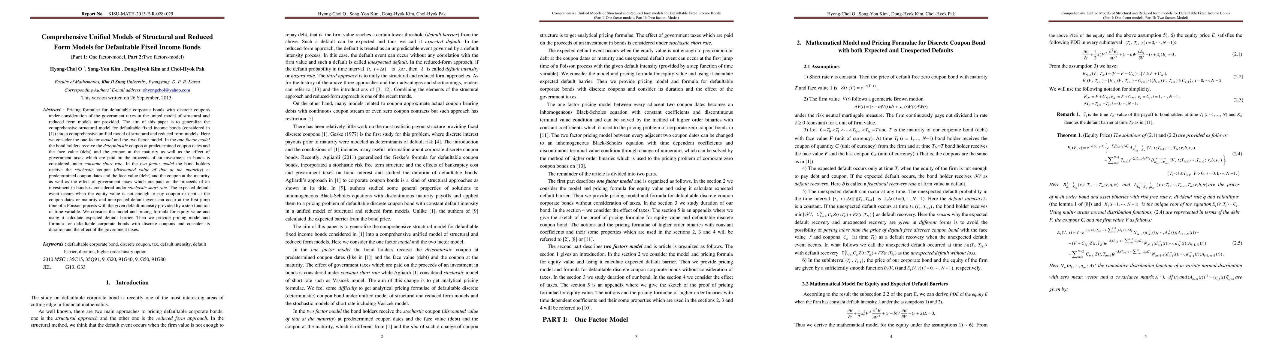 This paper presents unified models for pricing defaultable fixed income bonds, integrating structural and reduced form approaches. It develops pricing formulae for defaultable corporate bonds with discrete coupons under government tax considerations, comparing one-factor and two-factor models, with the latter incorporating stochastic elements.
