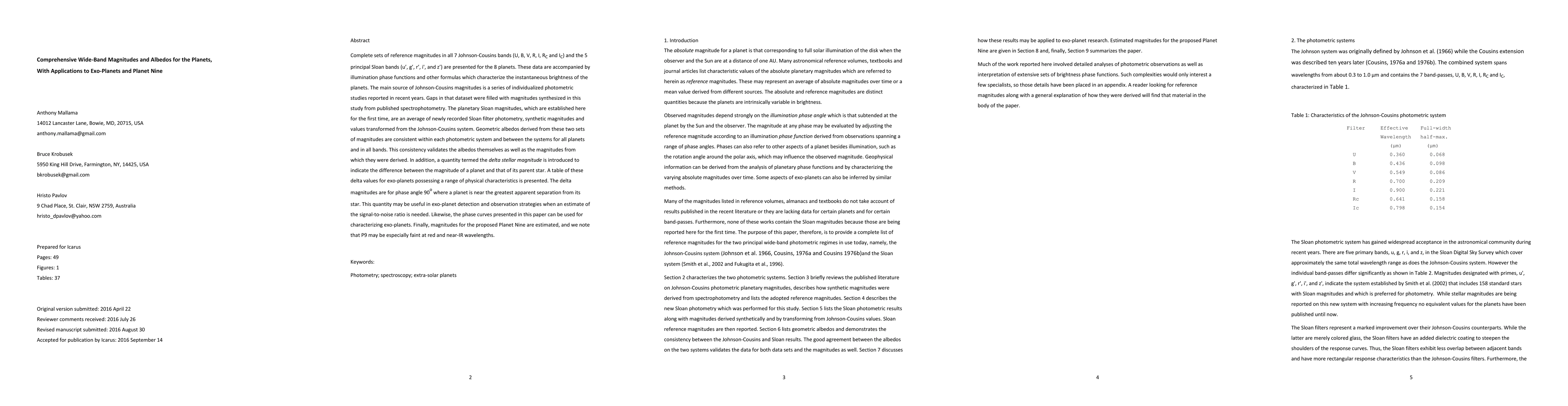 Complete sets of reference magnitudes in all 7 Johnson-Cousins bands (U, B, V, R, I, Rc and Ic) and the 5 principal Sloan bands (u', g', r', i', and z') are presented for the 8 planets. These data are accompanied by illumination phase functions and other formulas which characterize the instantaneous brightness of the planets. The main source of Johnson-Cousins magnitudes is a series of individualized photometric studies reported in recent years. Gaps in that dataset were filled with magnitudes synthesized in this study from published spectrophotometry. The planetary Sloan magnitudes, which are established here for the first time, are an average of newly recorded Sloan filter photometry, synthetic magnitudes and values transformed from the Johnson-Cousins system. Geometric albedos derived from these two sets of magnitudes are consistent within each photometric system and between the systems for all planets and in all bands. This consistency validates the albedos themselves as well as the magnitudes from which they were derived. In addition, a quantity termed the delta stellar magnitude is introduced to indicate the difference between the magnitude of a planet and that of its parent star. A table of these delta values for exo-planets possessing a range of physical characteristics is presented. The delta magnitudes are for phase angle 90 degrees where a planet is near the greatest apparent separation from its star. This quantity may be useful in exo-planet detection and observation strategies when an estimate of the signal-to-noise ratio is needed. Likewise, the phase curves presented in this paper can be used for characterizing exo-planets. Finally, magnitudes for the proposed Planet Nine are estimated, and we note that P9 may be especially faint at red and near-IR wavelengths.