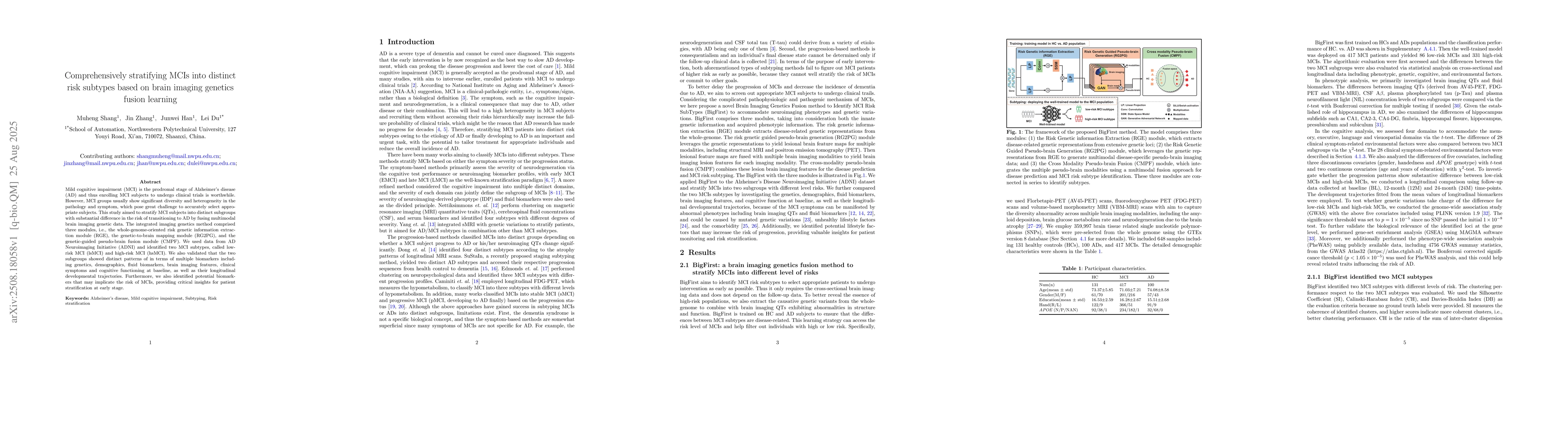 Mild cognitive impairment (MCI) is the prodromal stage of Alzheimer's disease (AD) and thus enrolling MCI subjects to undergo clinical trials is worthwhile. However, MCI groups usually show significant diversity and heterogeneity in the pathology and symptom, which pose great challenge to accurately select appropriate subjects. This study aimed to stratify MCI subjects into distinct subgroups with substantial difference in the risk of transitioning to AD by fusing multimodal brain imaging genetic data. The integrated imaging genetics method comprised three modules, i.e., the whole-genome-oriented risk genetic information extraction module (RGE), the genetic-to-brain mapping module (RG2PG), and the genetic-guided pseudo-brain fusion module (CMPF). We used data from AD Neuroimaging Initiative (ADNI) and identified two MCI subtypes, called low-risk MCI (lsMCI) and high-risk MCI (hsMCI). We also validated that the two subgroups showed distinct patterns of in terms of multiple biomarkers including genetics, demographics, fluid biomarkers, brain imaging features, clinical symptoms and cognitive functioning at baseline, as well as their longitudinal developmental trajectories. Furthermore, we also identified potential biomarkers that may implicate the risk of MCIs, providing critical insights for patient stratification at early stage.