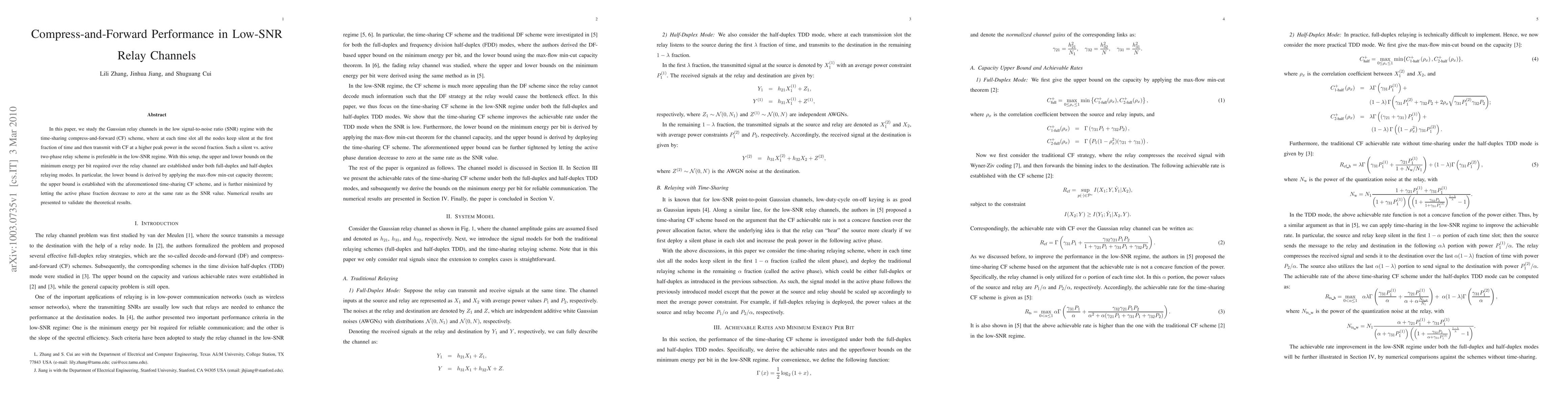 In this paper, we study the Gaussian relay channels in the low signal-to-noise ratio (SNR) regime with the time-sharing compress-and-forward (CF) scheme, where at each time slot all the nodes keep silent at the first fraction of time and then transmit with CF at a higher peak power in the second fraction. Such a silent vs. active two-phase relay scheme is preferable in the low-SNR regime. With this setup, the upper and lower bounds on the minimum energy per bit required over the relay channel are established under both full-duplex and half-duplex relaying modes. In particular, the lower bound is derived by applying the max-flow min-cut capacity theorem; the upper bound is established with the aforementioned time-sharing CF scheme, and is further minimized by letting the active phase fraction decrease to zero at the same rate as the SNR value. Numerical results are presented to validate the theoretical results.