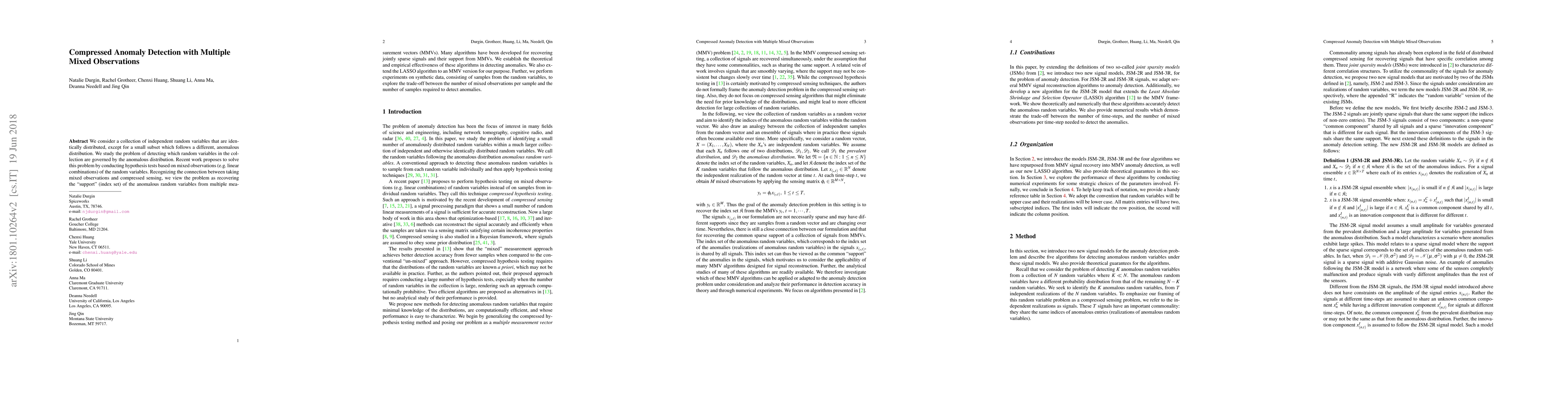 We consider a collection of independent random variables that are identically distributed, except for a small subset which follows a different, anomalous distribution. We study the problem of detecting which random variables in the collection are governed by the anomalous distribution. Recent work proposes to solve this problem by conducting hypothesis tests based on mixed observations (e.g. linear combinations) of the random variables. Recognizing the connection between taking mixed observations and compressed sensing, we view the problem as recovering the "support" (index set) of the anomalous random variables from multiple measurement vectors (MMVs). Many algorithms have been developed for recovering jointly sparse signals and their support from MMVs. We establish the theoretical and empirical effectiveness of these algorithms at detecting anomalies. We also extend the LASSO algorithm to an MMV version for our purpose. Further, we perform experiments on synthetic data, consisting of samples from the random variables, to explore the trade-off between the number of mixed observations per sample and the number of samples required to detect anomalies.