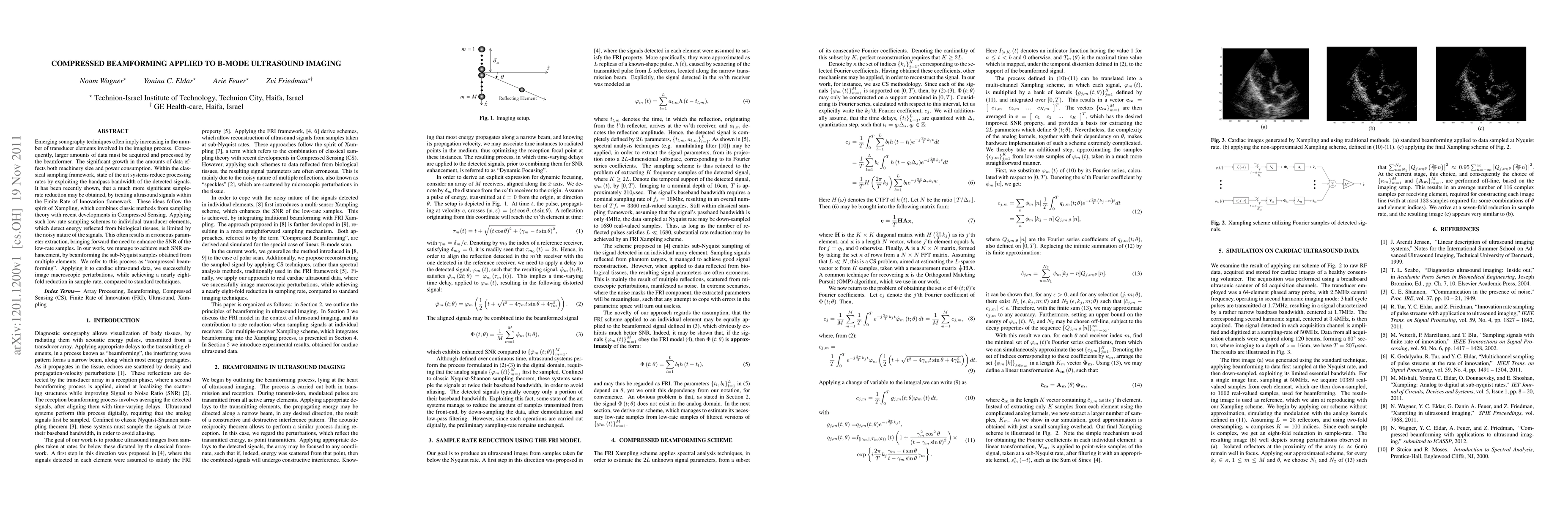 This paper proposes "compressed beamforming" to enhance the signal-to-noise ratio (SNR) in low-rate sampled ultrasound signals, enabling nearly eight-fold reduction in sample-rate compared to standard techniques. The method successfully images macroscopic perturbations in cardiac ultrasound data.