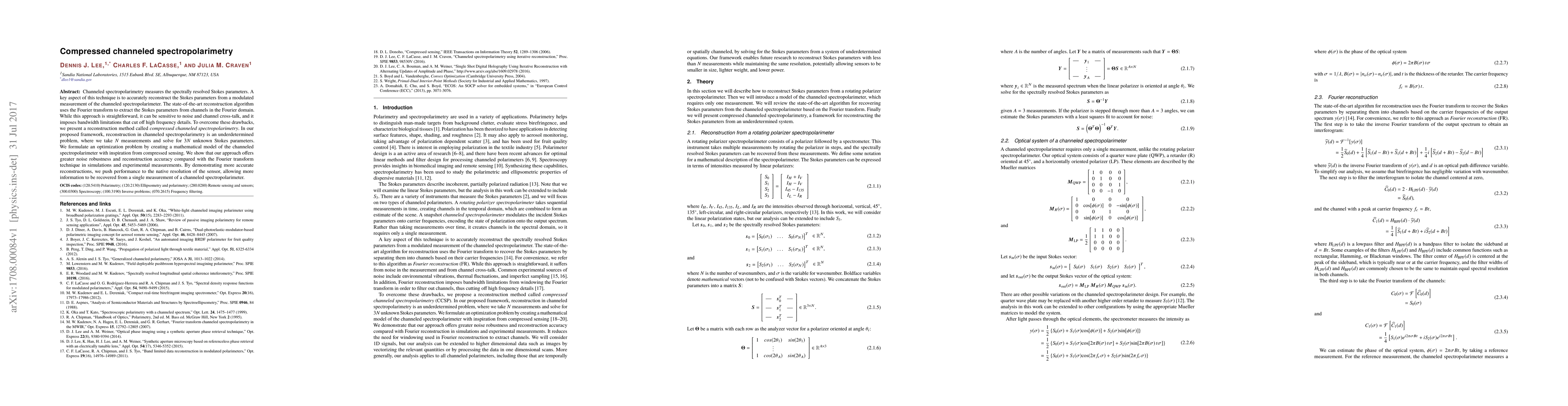 This paper introduces a novel reconstruction method called compressed channeled spectropolarimetry to improve the accuracy and noise robustness of spectrally resolved Stokes parameters measurement. It outperforms traditional Fourier transform-based reconstruction by leveraging compressed sensing techniques, achieving higher resolution and more information recovery from single measurements.