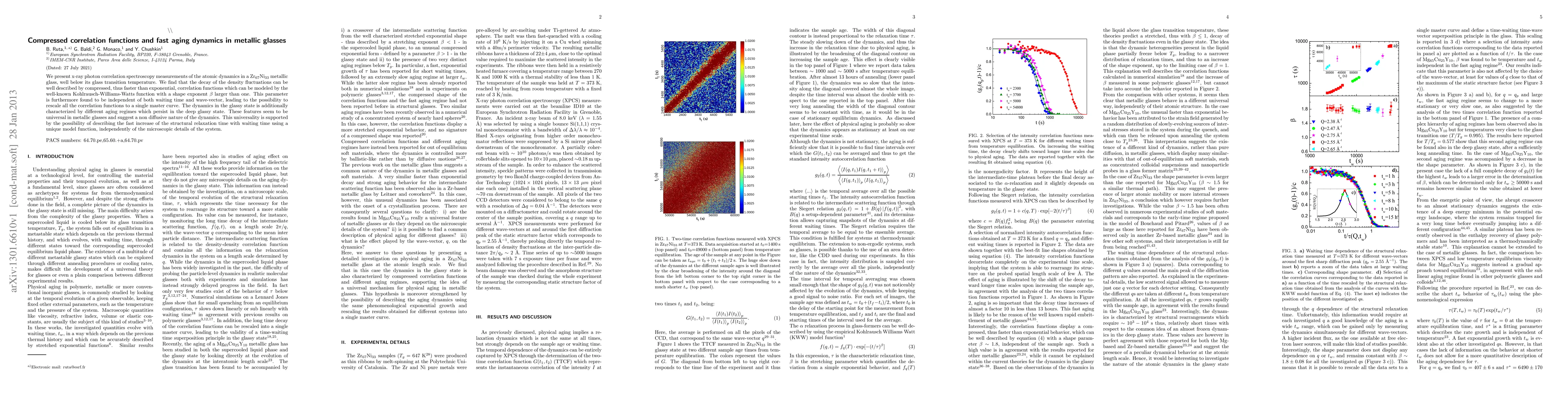 We present x-ray photon correlation spectroscopy measurements of the atomic dynamics in a Zr67Ni33 metallic glass, well below its glass transition temperature. We find that the decay of the density fluctuations can be well described by compressed, thus faster than exponential, correlation functions which can be modeled by the well-known Kohlrausch-Williams-Watts function with a shape exponent {\beta} larger than one. This parameter is furthermore found to be independent of both waiting time and wave-vector, leading to the possibility to rescale all the correlation functions to a single master curve. The dynamics in the glassy state is additionally characterized by different aging regimes which persist in the deep glassy state. These features seem to be universal in metallic glasses and suggest a non diffusive nature of the dynamics. This universality is supported by the possibility of describing the fast increase of the structural relaxation time with waiting time using a unique model function, independently of the microscopic details of the system.