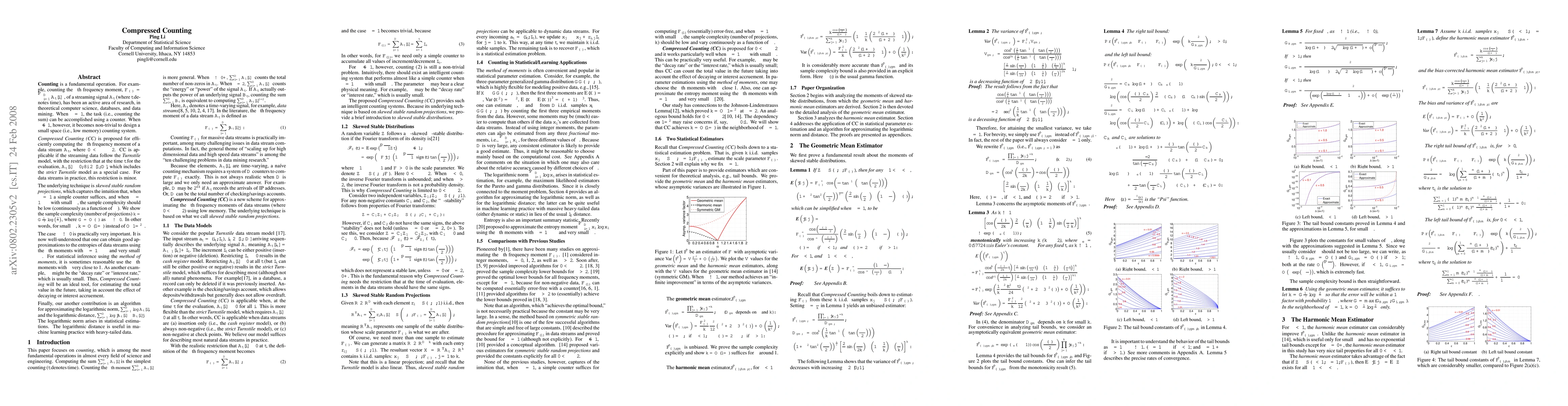 Counting is among the most fundamental operations in computing. For example, counting the pth frequency moment has been a very active area of research, in theoretical computer science, databases, and data mining. When p=1, the task (i.e., counting the sum) can be accomplished using a simple counter. Compressed Counting (CC) is proposed for efficiently computing the pth frequency moment of a data stream signal A_t, where 0
