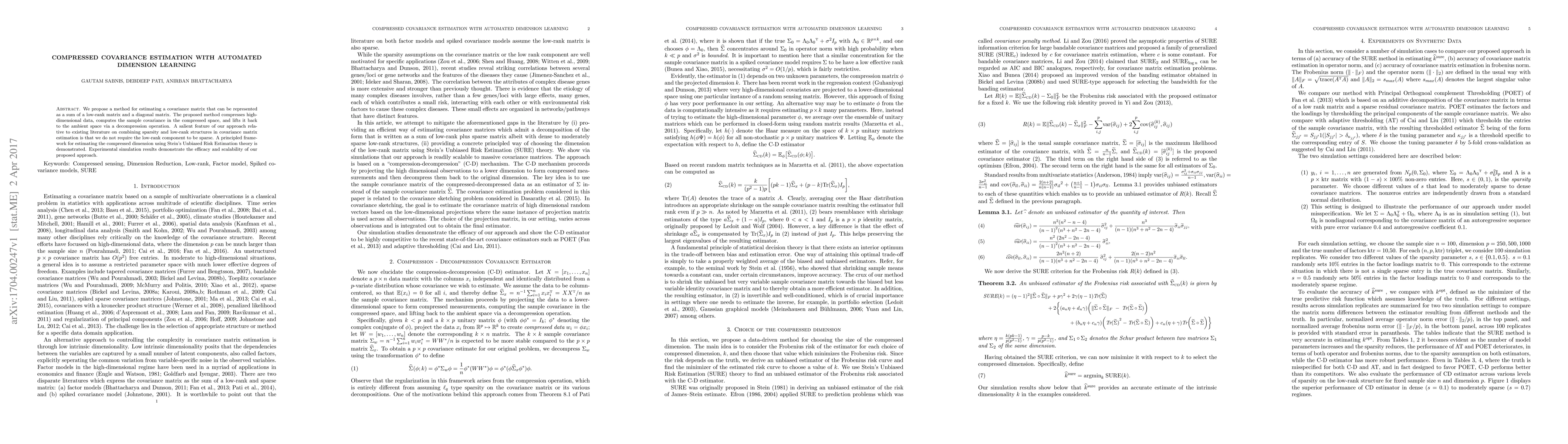 This paper introduces a method for estimating a covariance matrix by compressing high-dimensional data into a low-rank plus diagonal form, without requiring sparsity in the low-rank component. It employs a principled framework for automated dimension learning based on Stein's Unbiased Risk Estimation theory, demonstrating improved efficacy and scalability through experimental simulations.