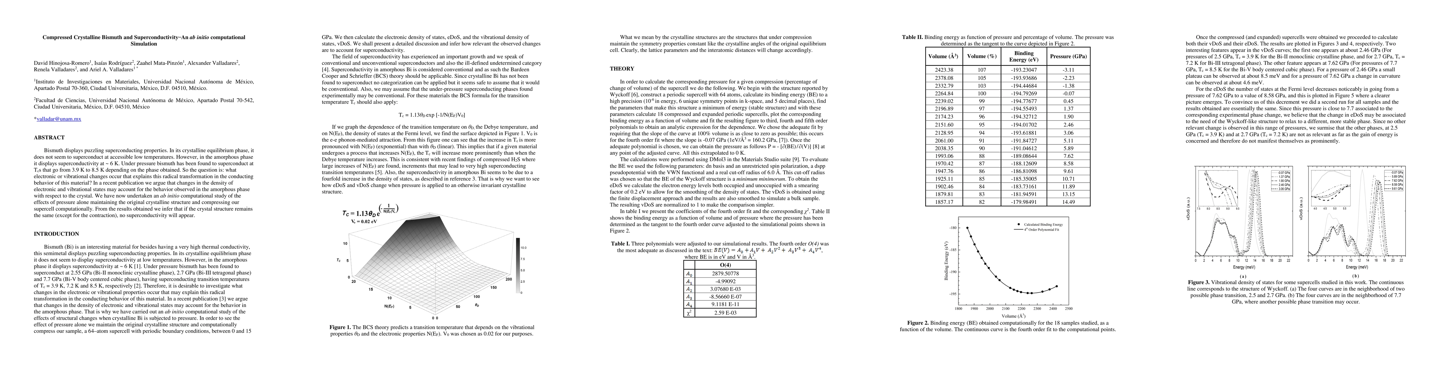 Bismuth displays puzzling superconducting properties. In its crystalline equilibrium phase, it does not seem to superconduct at accessible low temperatures. However, in the amorphous phase it displays superconductivity at ~ 6 K. Under pressure bismuth has been found to superconduct at Tcs that go from 3.9 K to 8.5 K depending on the phase obtained. So the question is: what electronic or vibrational changes occur that explains this radical transformation in the conducting behavior of this material? In a recent publication we argue that changes in the density of electronic and vibrational states may account for the behavior observed in the amorphous phase with respect to the crystal. We have now undertaken an ab initio computational study of the effects of pressure alone maintaining the original crystalline structure and compressing our supercell computationally. From the results obtained we infer that if the crystal structure remains the same (except for the contraction), no superconductivity will appear.
