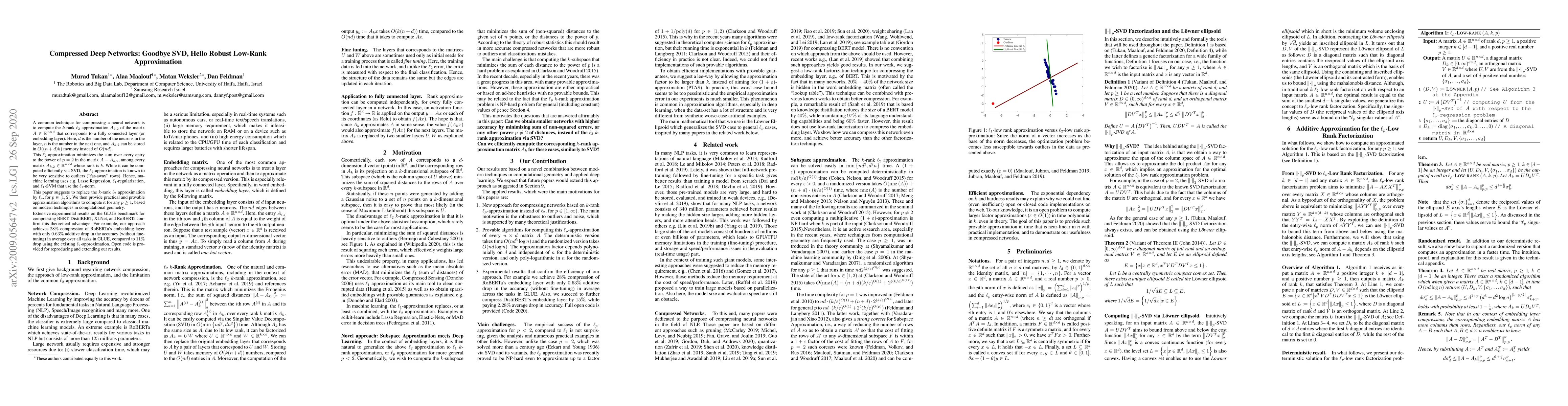 A common technique for compressing a neural network is to compute the $k$-rank $\ell_2$ approximation $A_{k,2}$ of the matrix $A\in\mathbb{R}^{n\times d}$ that corresponds to a fully connected layer (or embedding layer). Here, $d$ is the number of the neurons in the layer, $n$ is the number in the next one, and $A_{k,2}$ can be stored in $O((n+d)k)$ memory instead of $O(nd)$. This $\ell_2$-approximation minimizes the sum over every entry to the power of $p=2$ in the matrix $A - A_{k,2}$, among every matrix $A_{k,2}\in\mathbb{R}^{n\times d}$ whose rank is $k$. While it can be computed efficiently via SVD, the $\ell_2$-approximation is known to be very sensitive to outliers ("far-away" rows). Hence, machine learning uses e.g. Lasso Regression, $\ell_1$-regularization, and $\ell_1$-SVM that use the $\ell_1$-norm. This paper suggests to replace the $k$-rank $\ell_2$ approximation by $\ell_p$, for $p\in [1,2]$. We then provide practical and provable approximation algorithms to compute it for any $p\geq1$, based on modern techniques in computational geometry. Extensive experimental results on the GLUE benchmark for compressing BERT, DistilBERT, XLNet, and RoBERTa confirm this theoretical advantage. For example, our approach achieves $28\%$ compression of RoBERTa's embedding layer with only $0.63\%$ additive drop in the accuracy (without fine-tuning) in average over all tasks in GLUE, compared to $11\%$ drop using the existing $\ell_2$-approximation. Open code is provided for reproducing and extending our results.