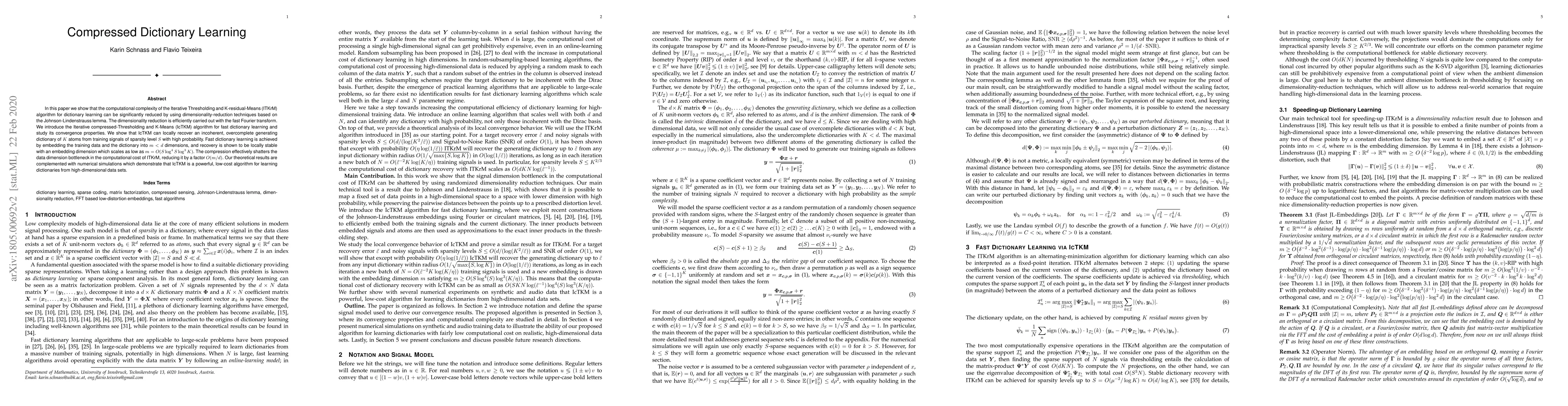 This paper proposes the Iterative compressed-Thresholding and K-Means (IcTKM) algorithm to reduce the computational complexity of dictionary learning using dimensionality reduction techniques based on the Johnson-Lindenstrauss lemma. The method achieves fast dictionary learning by embedding data into lower dimensions, significantly reducing the computational cost and demonstrating effective local recovery of sparse dictionaries.