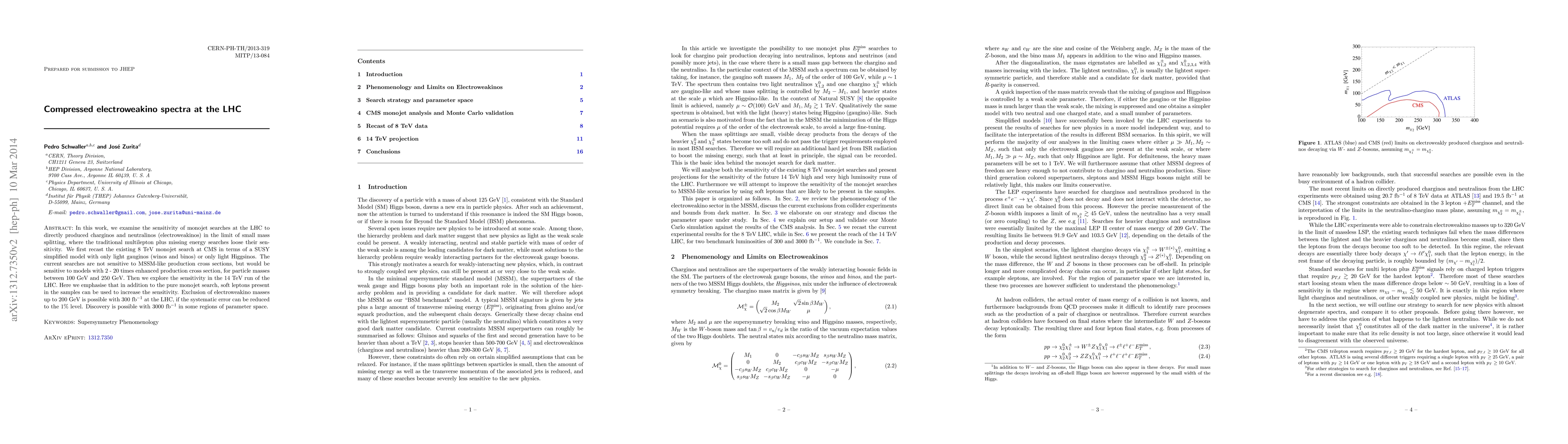 This research explores the sensitivity of LHC monojet searches to light electroweakinos (charginos and neutralinos) with small mass splitting, where traditional multilepton searches are less effective. Current 8 TeV searches aren't sensitive to MSSM cross sections, but could detect models with enhanced production. The 14 TeV LHC could exclude electroweakino masses up to 200 GeV with 300 fb$^{-1}$ and 1% systematic error, with discovery possible in some regions with 3000 fb$^{-1}$.