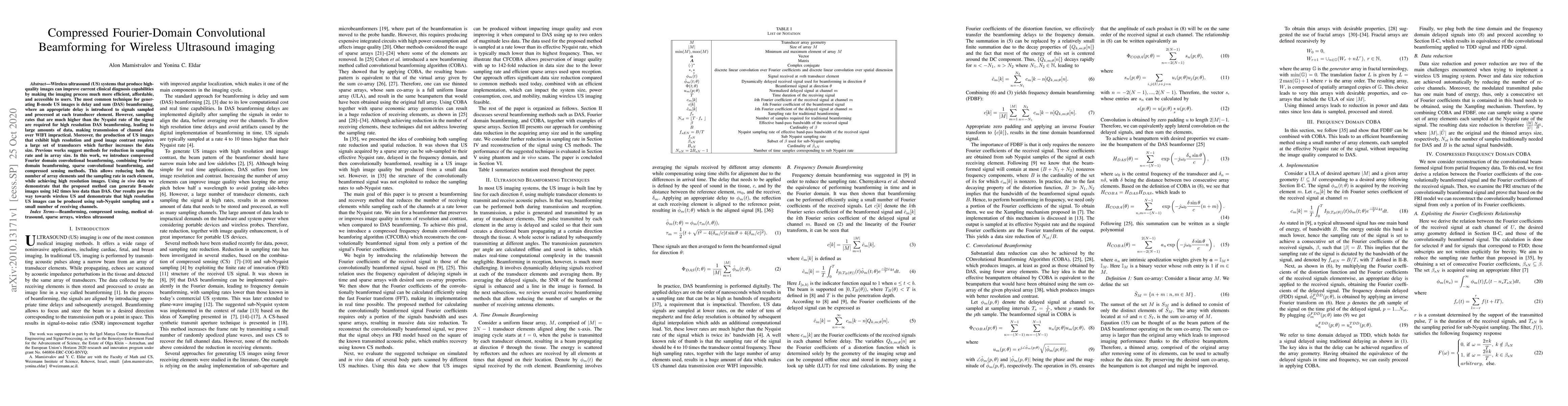 This paper proposes a compressed Fourier-domain convolutional beamforming technique to enhance wireless ultrasound imaging, significantly reducing data size and array element count while maintaining high-resolution images. The method combines Fourier domain beamforming, sparse convolutional beamforming, and compressed sensing, demonstrating a 142-fold reduction in data compared to traditional delay and sum beamforming.