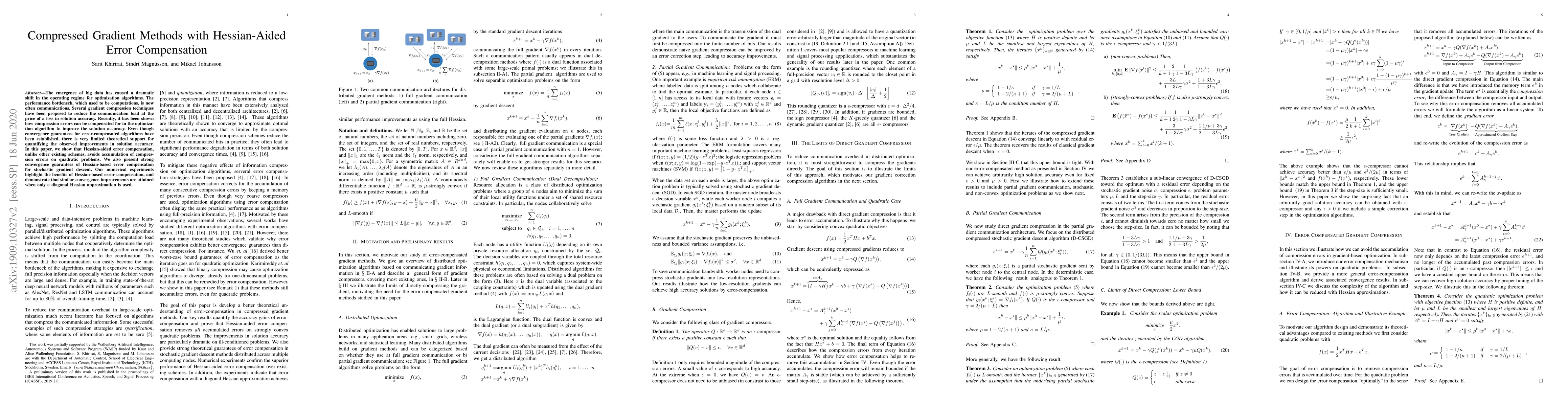 This paper proposes a Hessian-aided error compensation method for compressed gradient optimization, demonstrating strong convergence guarantees for stochastic gradient descent. It shows that this approach effectively avoids the accumulation of compression errors, leading to improved solution accuracy, even with a diagonal Hessian approximation.
